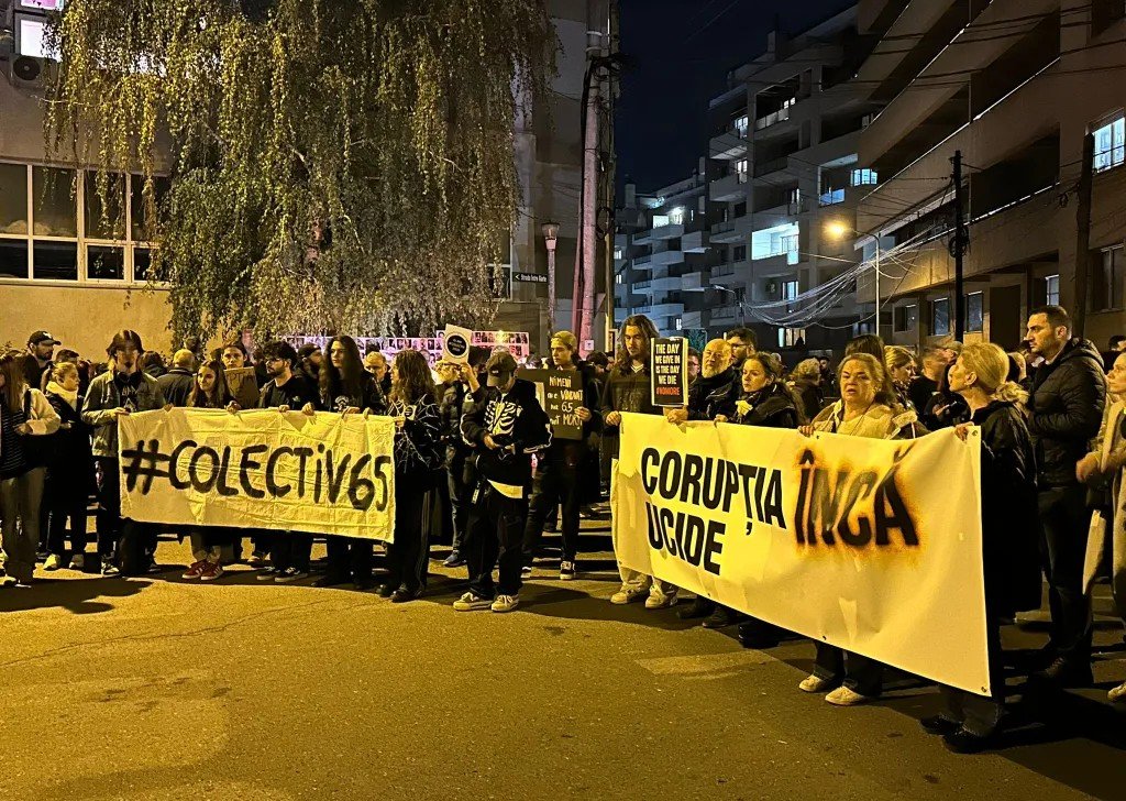 A résztvevők transzparenseket tartottak a kezükben olyan üzenetekkel, mint: „A korrupció még mindig öl”, „10 év a Colectiv után, és még mindig nincs égési sérülteket ellátó kórház”, vagy „#Colectiv65”.