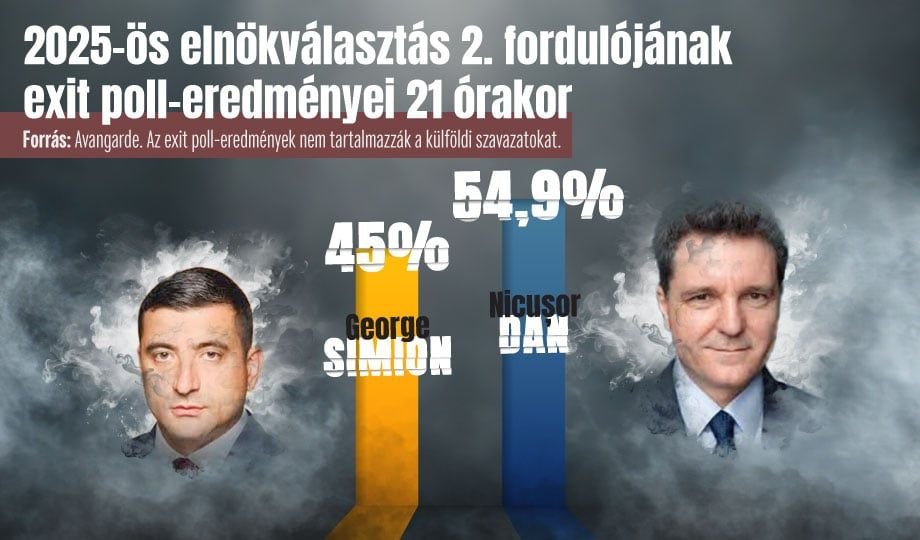 A szavazókörzetből való kilépéskor megkérdezett választók válaszai alapján az Avangarde közvélemény-kutató cég által összeállított exit poll-kutatás becslései szerint a független Nicușor Danra, Bukarest főpolgármesterére szavaztak többen a május 18-án Romániában lezajlott elnökválasztás második fordulójában. Az Avangarde által végzett kutatás a 19 órás állapotokat rögzíti, és eszerint Nicușor Dan 54,9 százalékot ért el, míg George Simion, a Szövetség a Románok Egységéért Párt (AUR) jelöltje 45,1 százaléknyi voksot kapott.