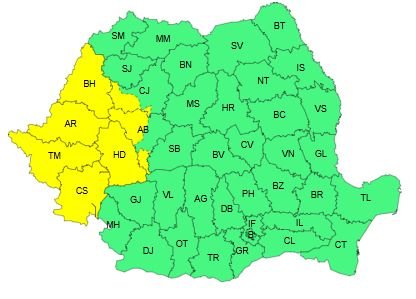 Zivatarokra figyelmeztető sárga jelzésű riasztást adott ki csütörtökön az Országos Meteorológiai Szolgálat (ANM) az ország hét megyéjére. Az előrejelzések szerint csütörtök déltől 21 óráig a Bánságban, Körösvidéken és Erdély nyugati részén a fokozott légköri instabilitás miatt villámlással kísért záporokra, felhőszakadásra, felerősödő szélre és helyenként jégesőre is számítani lehet.