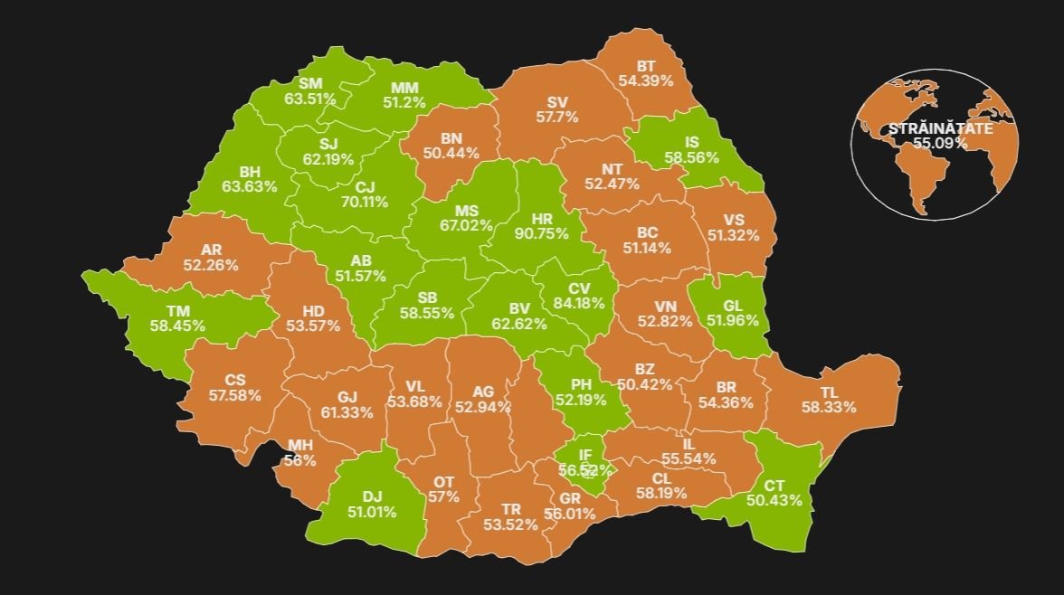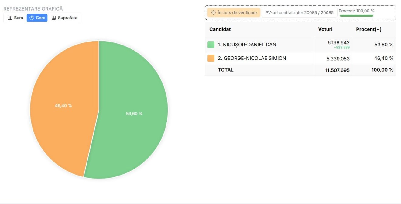 A rendszerváltás utáni elnökválasztások történetének legnagyobb fordulatát hajtotta végre Nicușor Dan, Bukarest főpolgármestere, aki az idei államfőválasztás első fordulójában húsz százalékkal kevesebb szavazatot kapott, mint ellenfele, George Simion, a Szövetség a Románok Egységéért (AUR) párt jelöltje, de a második fordulóban mégis sikerült tíz százalékot rávernie a szélsőséges politikusra. A szavazatok 98,5 százalékának megszámlálása után Nicușor Dan az országban és külhonban leadott voksok 54,17 százalékát szerezte meg, azaz összesen 5.828.054 szavazatot kapott. Az AUR jelöltje 4.929.904 voksot kapott, ez 45,83 százalékos eredmény.