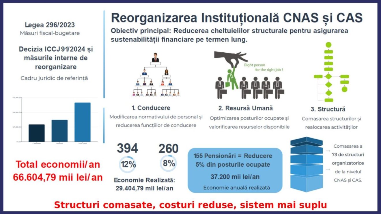 Az intézményvezető kiemeli, hogy országos és megyei szinten összesen 73 szervezeti egységet vontak össze, valamint csökkentették a személyi állományt. Az intézkedések eredményeként az éves megtakarítás meghaladja a 66,6 millió lejt.