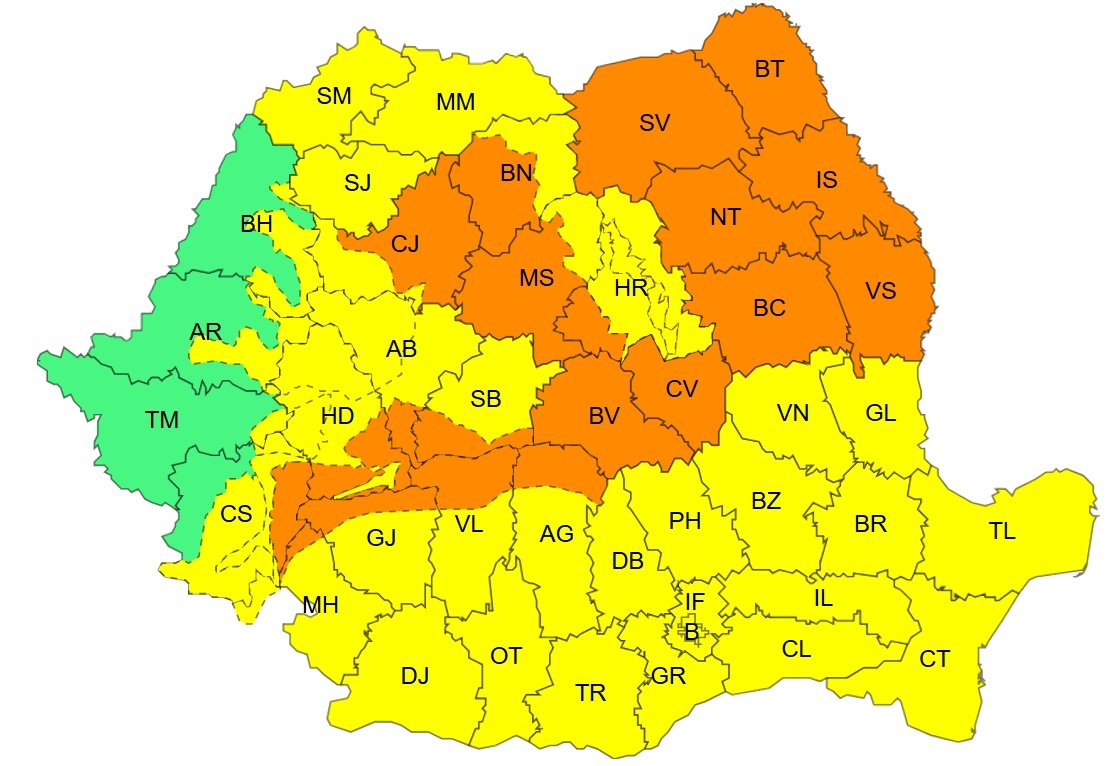 A szombat 16 óráig érvényes riasztás Botoșani, Iași, Vaslui, Galac, Vrancea és Mehedinți megye teljes területére, illetve Konstanca, Tulcea, Krassó-Szörény, Hunyad, Gorj, Fehér, Szeben, Vâlcea, Brassó, Argeș, Dâmbovița, Prahova, Kovászna, Buzău, Bákó, Neamț és Suceava megye egy-egy részére terjed ki.