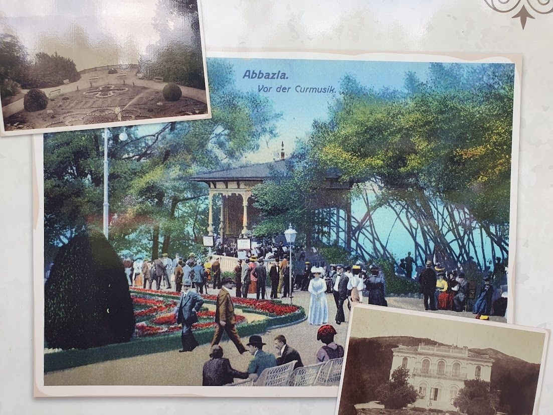 Az angolpark információs táblája régi képeslapokon idézi fel Opatija fénykorát, amikor az üdülőhely vendégei elegáns társasági életet éltek.