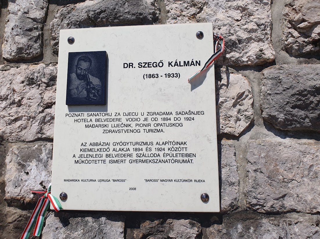 Dr. Szegő Kálmán emléktáblája az egykori Belvedere szálló alatt, aki három évtizeden át gyermek-szanatóriumot működtetett Abbáziában, és az üdülőhely gyógyhírnevét megalapozta.