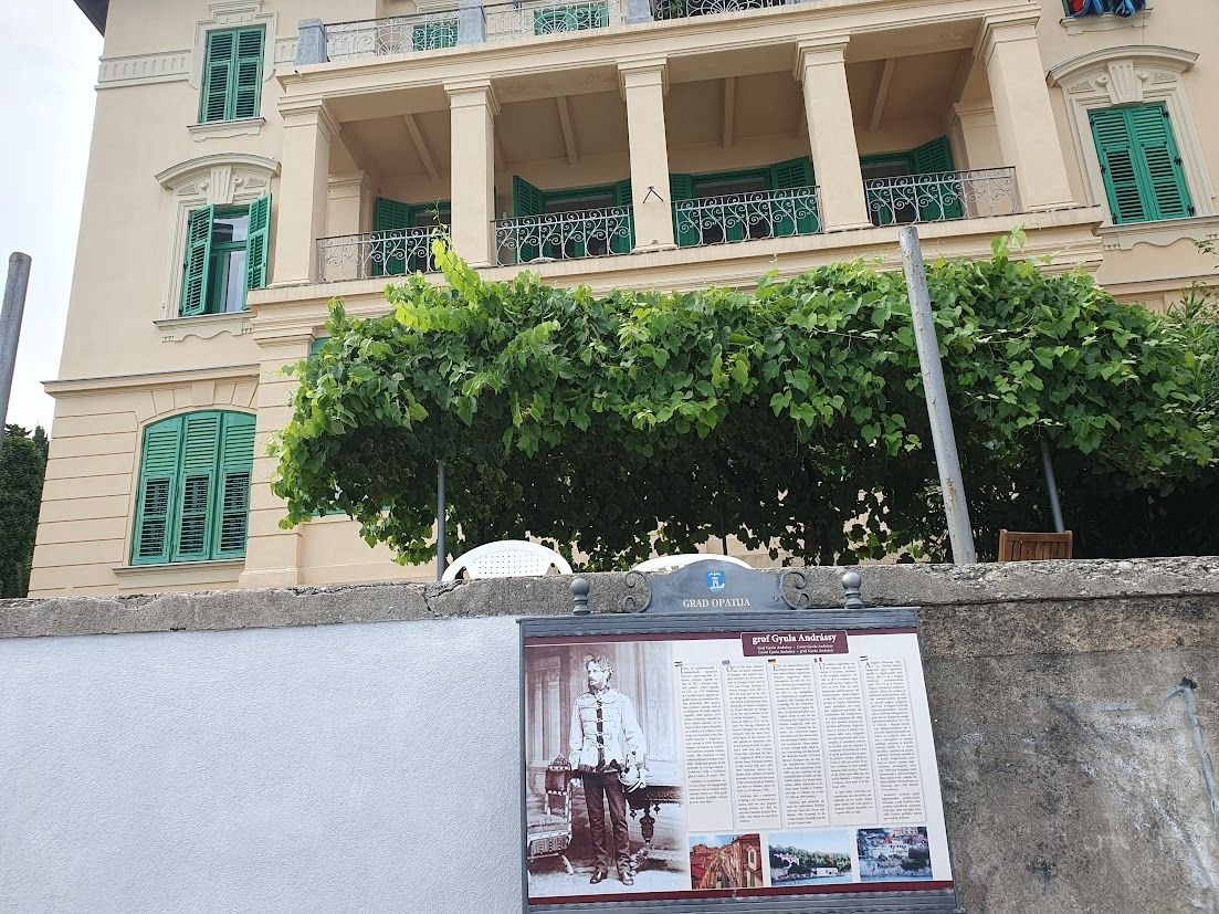 Gróf Andrássy Gyulára emlékeztető tábla Voloskóban, ahol a kiegyezés utáni Magyarország első miniszterelnöke élete utolsó hónapjait töltötte és 1890-ben elhunyt.