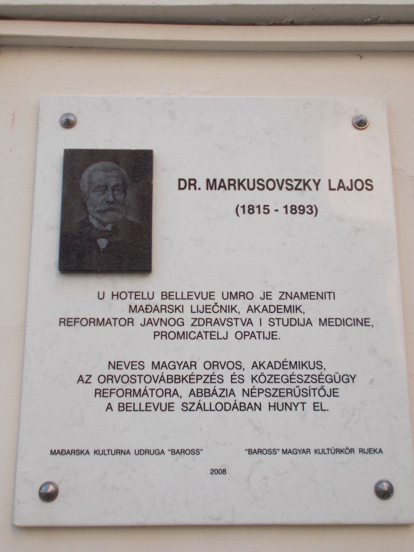 Dr. Markusovszky Lajos emléktáblája a Hotel Bellevue falán, aki szintén úttörő szerepet játszott Abbázia gyógyüdülőhelyi hírnevének megteremtésében.