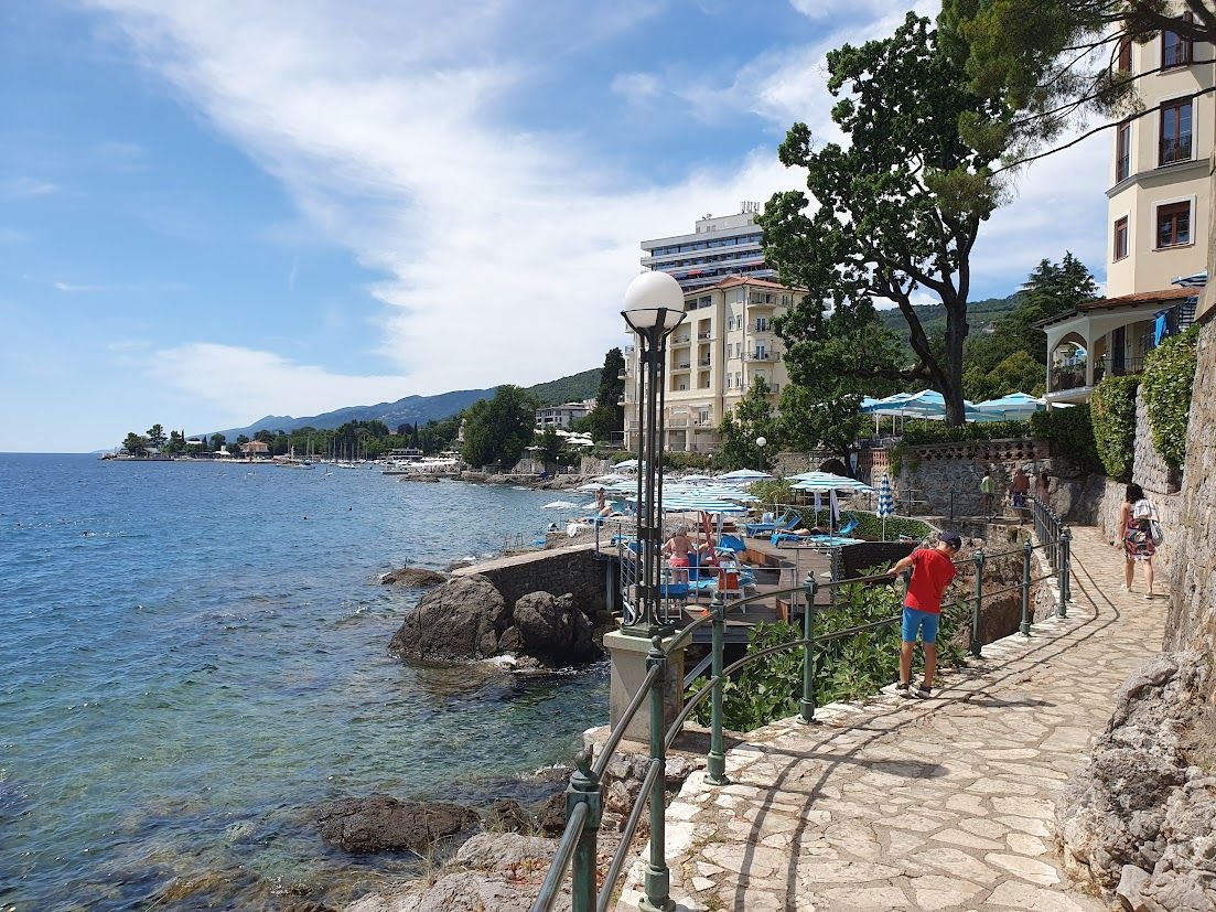 A Ferenc József sétány végeláthatatlanul kanyarog a tenger fölött, a sziklás part és a Kvarner-öböl látványa kíséri a sétálót.
