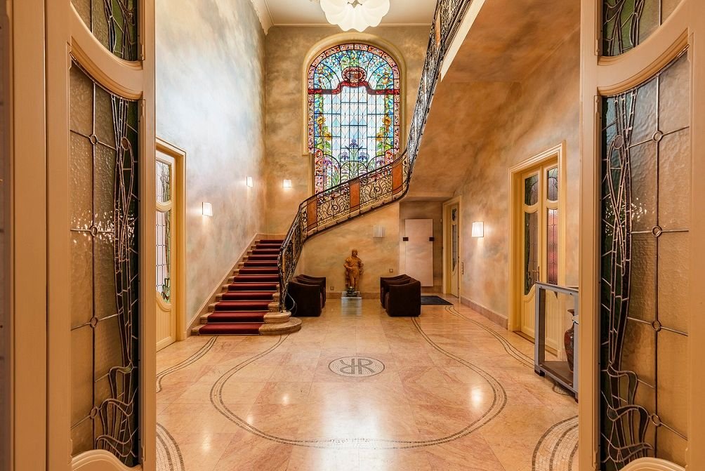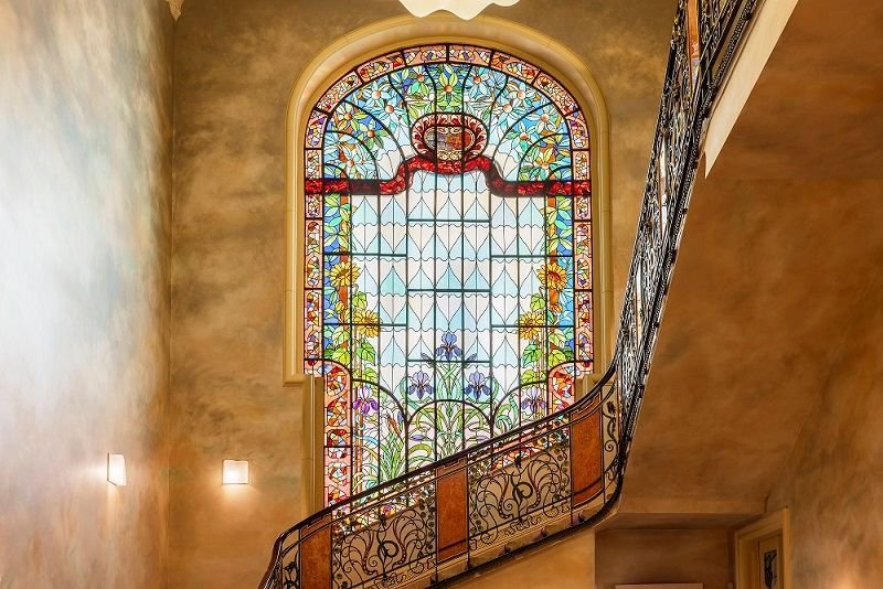 A házba belépve megcsodálhatjuk Roth Miksa, a szecessziós magyar üvegművészet legnagyobb mestere által készített hatalmas üvegablakot
