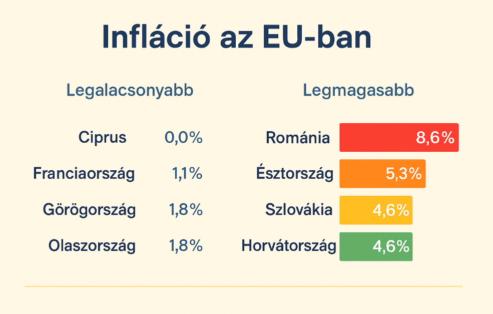 Az EU-ban a múlt hónapban Cipruson (0 százalék), Franciaországban (1,1), valamint Görögországban és Olaszországban (egyaránt 1,8) volt a legalacsonyabb az éves infláció, Romániában (8,6), Észtországban (5,3), valamint Szlovákiában és Horvátországban (egyaránt 4,6) pedig a legmagasabb.