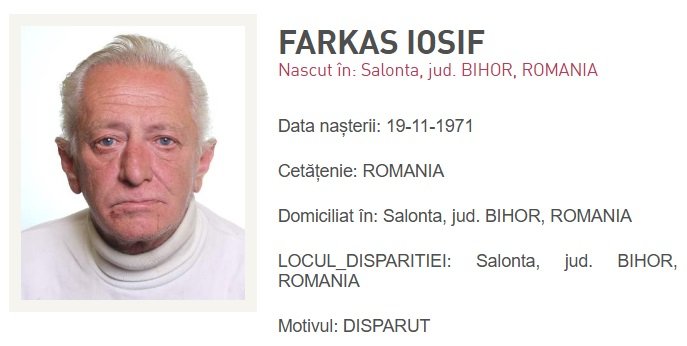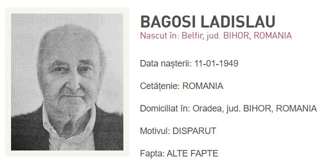 A másik eltűnt a bélfenyéri (Belfir) születésű, de Váradon élő 77 éves Bagosi Ladislau. Ő múlt év augusztusában hagyta el otthonát, azóta nyoma veszett. A férfi 1,60 méter magas és 60 kilogramm.