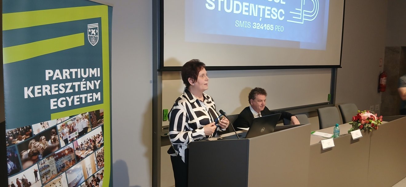 A továbbiakban dr. Pásztor Rita projektmenedzser ismertette a részleteket: az Oktatási és Foglalkoztatási Programból finanszírozott Út az egyetemi sikerhez (TSSS – Traseul spre succesul studențesc) projekt 2027. május 31-ig tart, a teljes költségvetés 7.337.348,00 lej. A projektben 351 fiatal vesz részt, közülük 175 középiskolás és 176 egyetemi hallgató. A projekt átfogó célja a hátrányos helyzetű diákok hozzáférésének és részvételének növelése a felsőoktatásban, valamint az egyetemi lemorzsolódás csökkentése a nagyváradi PKE hallgatói körében. Konkrét intézkedések közé tartozik: a személyre szabott támogatási tervek kidolgozása és megvalósítása, román és angol nyelvi kompetenciák fejlesztése, bentlakás és étkezési támogatás, ösztöndíjak, tanulássegítő tréningek, és nem utolsósorban a PKE épületének akadálymentesítése (fizikai akadálymentesítés, valamint digitális tanulást segítő alkalmazások beszerzése, illetve a fogyatékkal élő hallgatók számára nyújtott támogató szolgáltatások biztosítása). Mindezek hozzájárulnak a célcsoportba tartozó 351 fiatal foglalkoztathatóságának növeléséhez, és elősegítik fenntartható munkaerőpiaci sikerüket.