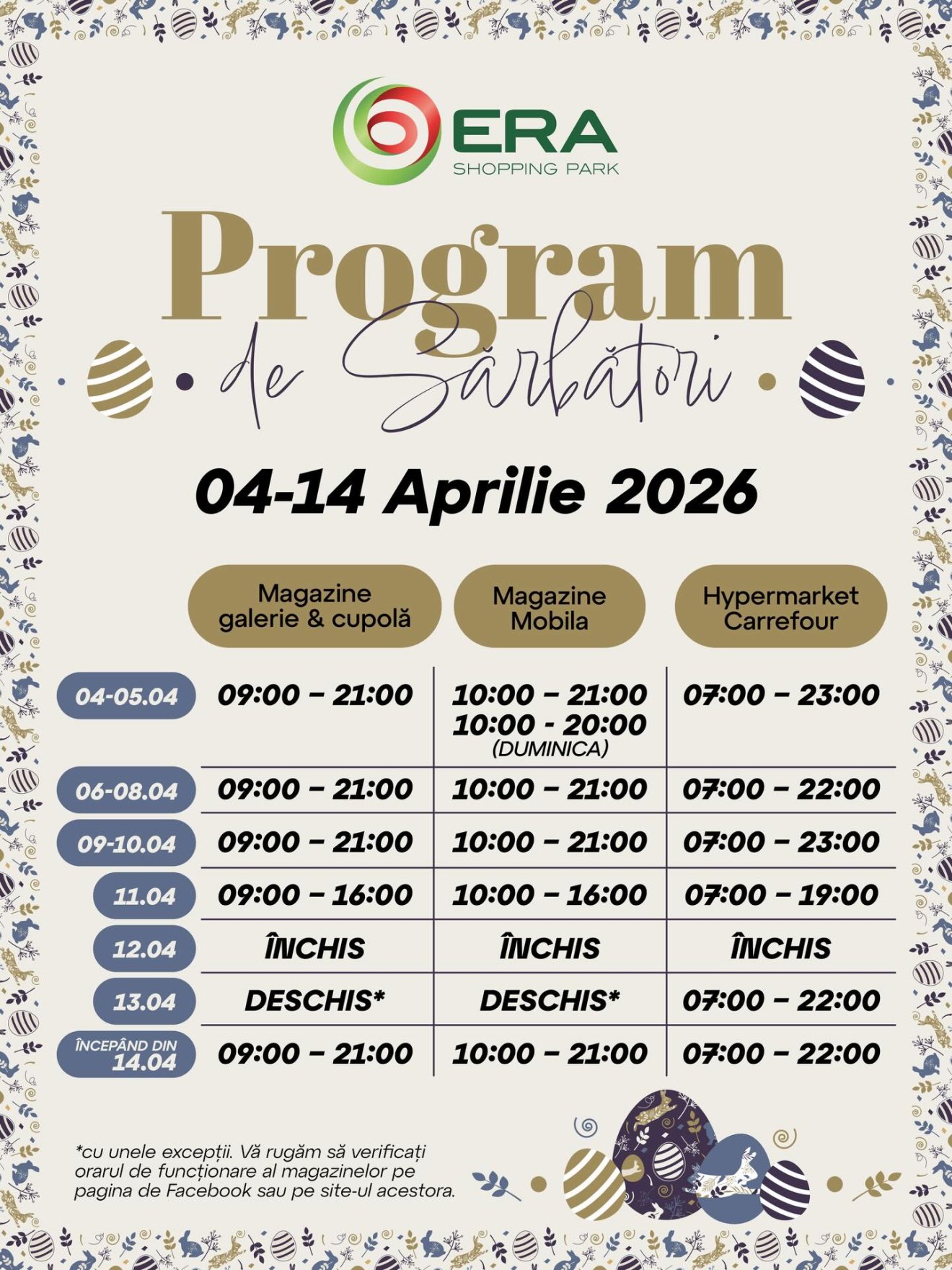 Szeretettel várjuk önöket a nagyváradi ERA Parkba, hogy ünnepi hangulatban és meglepetésekkel teli környezetben készüljünk a húsvéti ünnepekre!