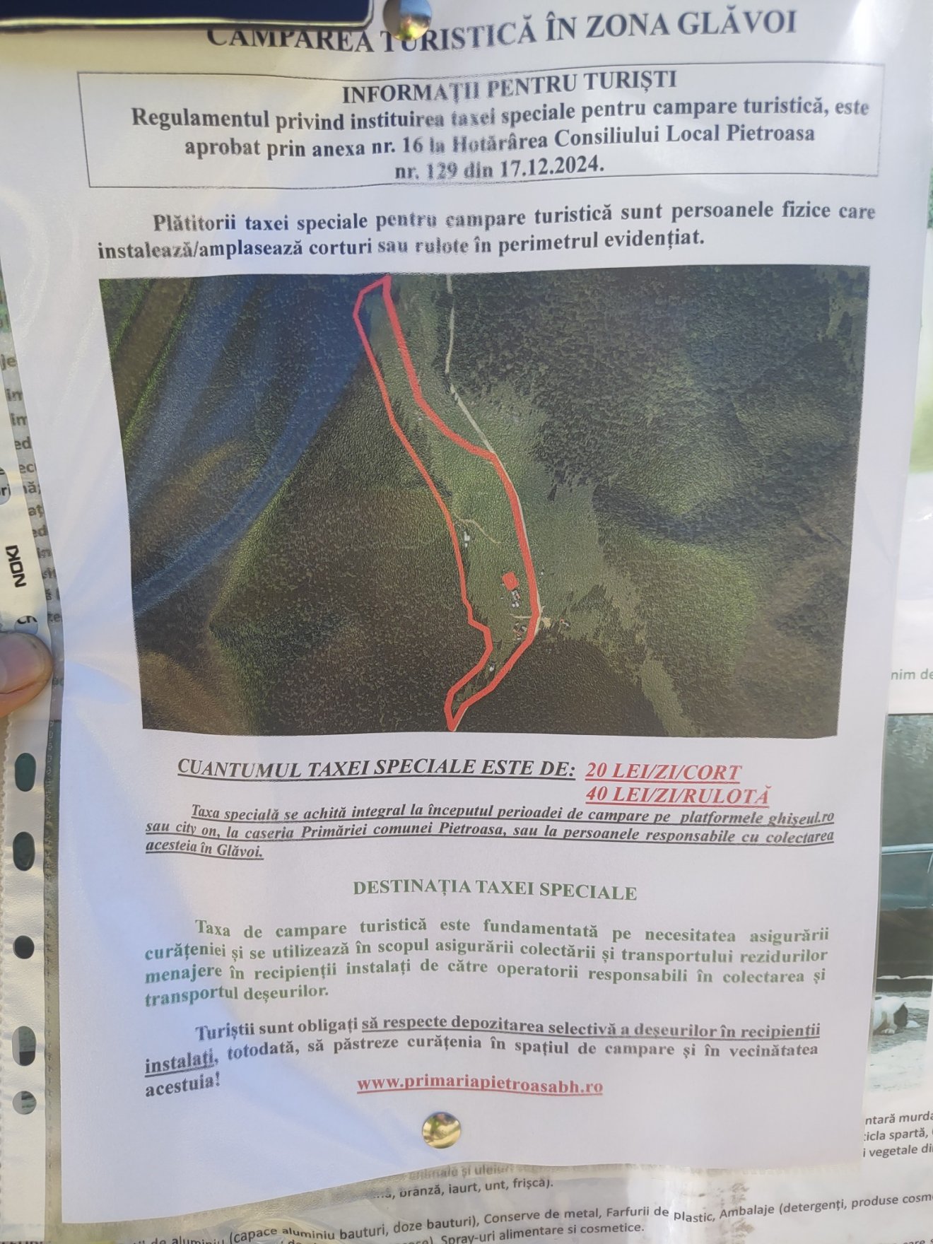 A speciális díj napi 20 lej egy sátorra, illetve napi 40 lej egy lakóautó után. A díjat egy összegben kell kifizetni még a sátor felállításakor vagy a kempingezés megkezdésekor online, a Vasaskőfalvai Polgármesteri Hivatal honlapján (pietroasa.cityon.ro – ehhez viszont regisztráció szükséges), valamint személyesen a helyi polgármesteri hivatal pénztáránál, illetve a díj beszedésével megbízott személyeknél.