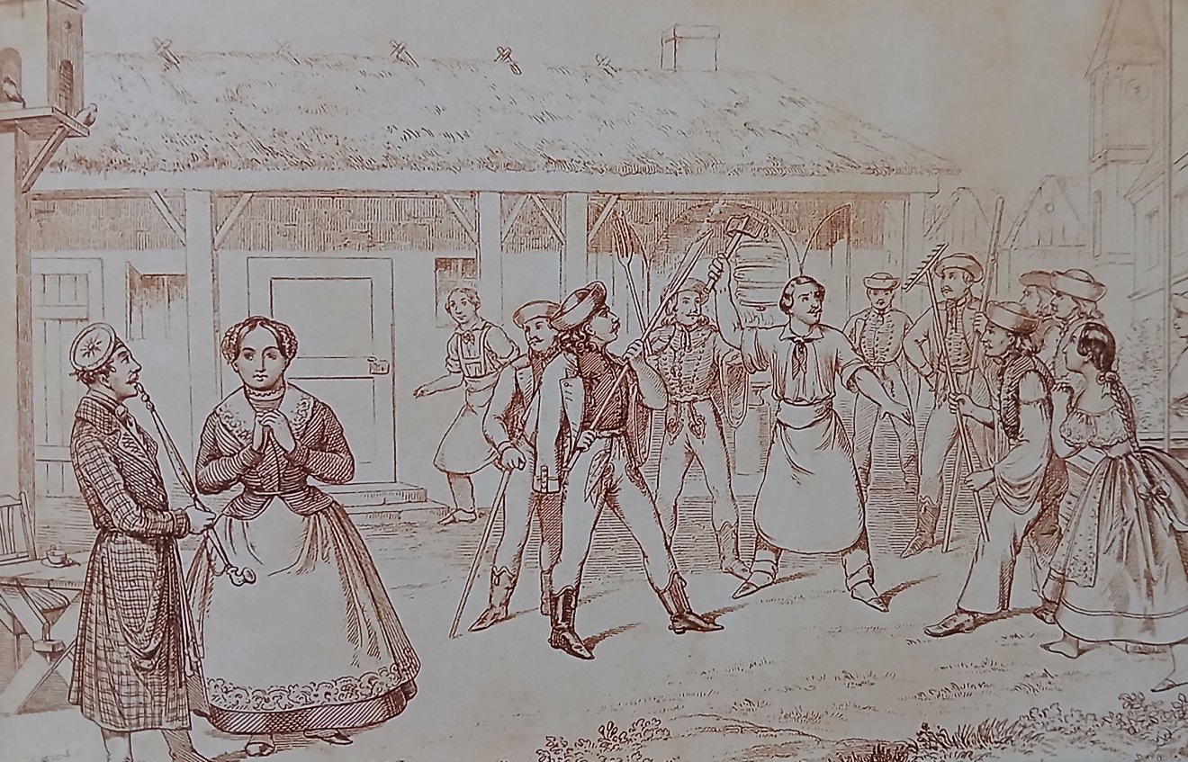 Jelenetkép a Szökött katona című népszínműből, Nemzeti Színház, 1843. Fuchsthaller Alajos acélmetszete, Színháztörténeti képeskönyv, Osiris, 2005