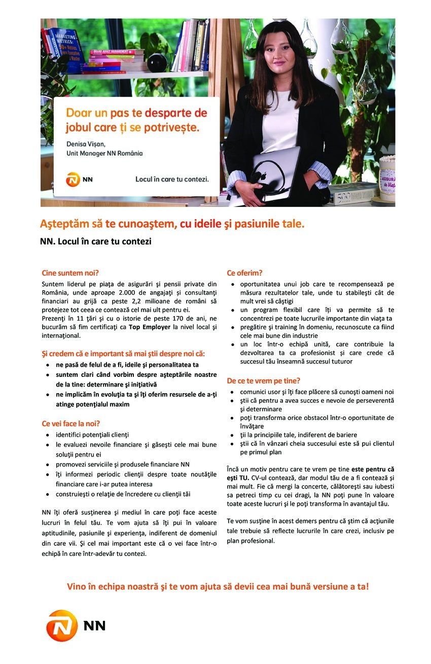 Az NN egy nemzetközi pénzügyi szolgáltató csoport, amely 28 éve aktív a román piacon, és élet-, egészség-, lakás- és magánnyugdíj-biztosítási megoldásokat kínál. A vállalat célja, hogy segítsen az embereknek megvédeni azt, ami a legfontosabb számukra, és biztosítani egy stabilabb pénzügyi jövőt. Jelenleg az NN Romániában több mint 500 embert foglalkoztat, valamint 1700 pénzügyi tanácsadót és értékesítési vezetőt, akiknek együttesen több mint 2,3 millió ügyfelük van. A társaság mindig olyan pénzügyi tanácsadókat és vezetőket keres, akik valódi hatást akarnak gyakorolni az emberek életére, támogatva őket egy jobb pénzügyi jövő biztosításában.
