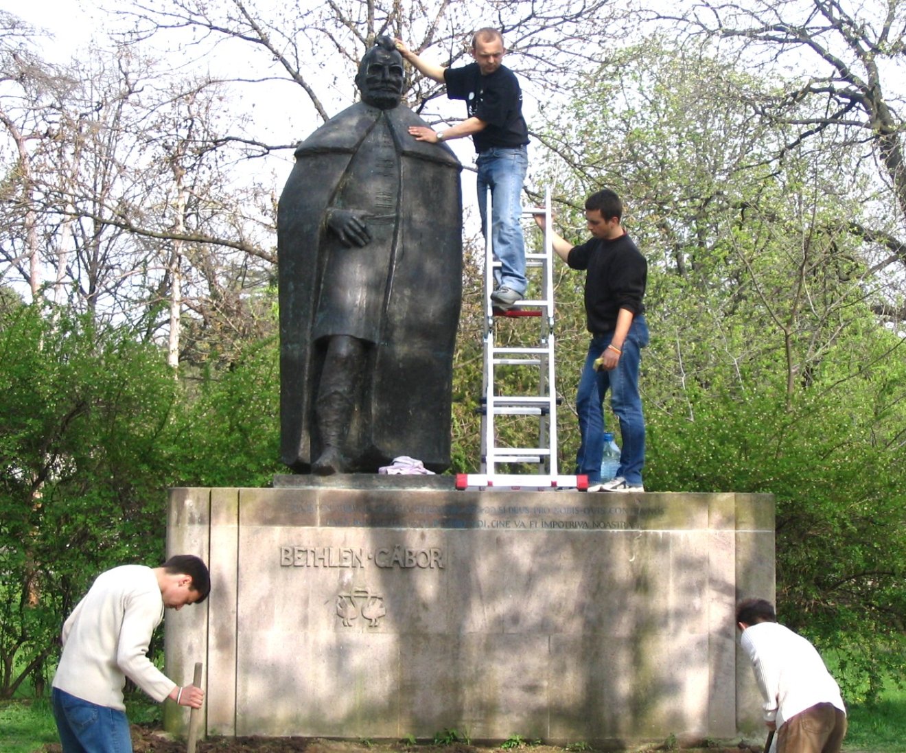 Nagyváradi fiatalok takarítják Bethlen Gábor szobrát 2006-ban