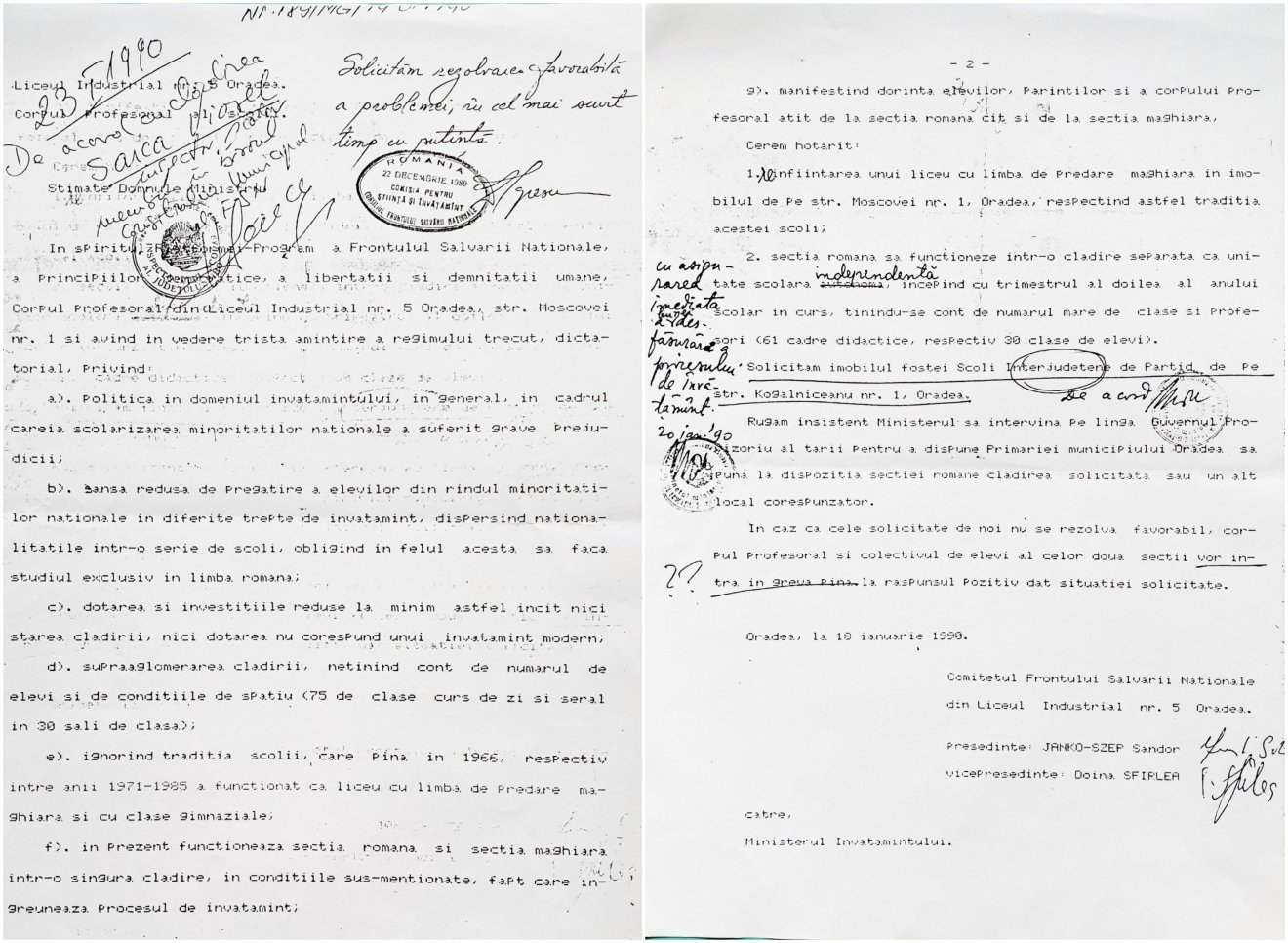 "Az Oktatási Minisztériumban azt mondták a delegációnak, hogy addig nem vehetik figyelembe a kérvényt, amíg a Nemzeti Megmentési Front tanügyi bizottsága nem hagyja jóvá azt, ezért először oda küldtek. Annak a bizottságnak a székhelye a Victoria-palotában volt, amit tankokkal és fegyveres katonákkal őriztek, nem lehetett oda csak úgy bemenni." Valahogy azonban mégis sikerült bejutniuk az épületbe. "A tanügyi bizottságban volt egy fiatalabb férfi, aki nagyon csodálkozott azon, hogy mit kérünk tőle. »Romániában tényleg van magyar iskola? Vajon jót teszek, ha aláírom?« – kérdezte csodálkozva, és a román kollégák kezdték győzködni, hogy igen." Akkor lepecsételte és aláírta a kérvényt a következő szöveggel: "Kérjük a probléma mielőbbi kedvező megoldását." A lepecsételt dokumentummal másnap, január 20-án délelőtt visszamentek a minisztériumba, Pálfalvi Attila pedig átvette tőlük az iratot. Délután ötkor jött ki, a dokumentumon pedig rajta volt Mihai Șora oktatási miniszter aláírása.