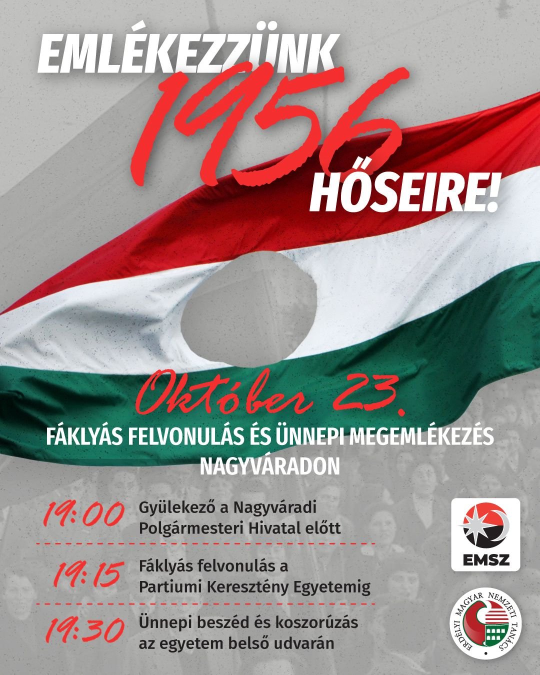 Október 23-án, csütörtökön este fáklyás felvonulással és ünnepi megemlékezéssel tisztelegnek Nagyváradon az 1956-os forradalom és szabadságharc hősei előtt. Az eseményt az Erdélyi Magyar Szövetség és az Erdélyi Magyar Nemzeti Tanács közösen szervezi. Az ünneplőket 19 órától várják gyülekezőre a Nagyváradi Polgármesteri Hivatal elé, ahonnan 19.15-kor indul a fáklyás felvonulás a Partiumi Keresztény Egyetemig. Az eseményt az egyetem belső udvarán tartott ünnepi megemlékezés zárja, ahol a résztvevők beszédeket hallgathatnak meg, majd elhelyezik az emlékezés koszorúit az 1956-os emléktáblánál. A szervezők szeretettel várnak minden érdeklődőt, hogy közösen róhassák le tiszteletüket a magyar szabadságért küzdők emléke előtt – áll az Erdélyi Magyar Szövetség sajtóirodájának közleményében.