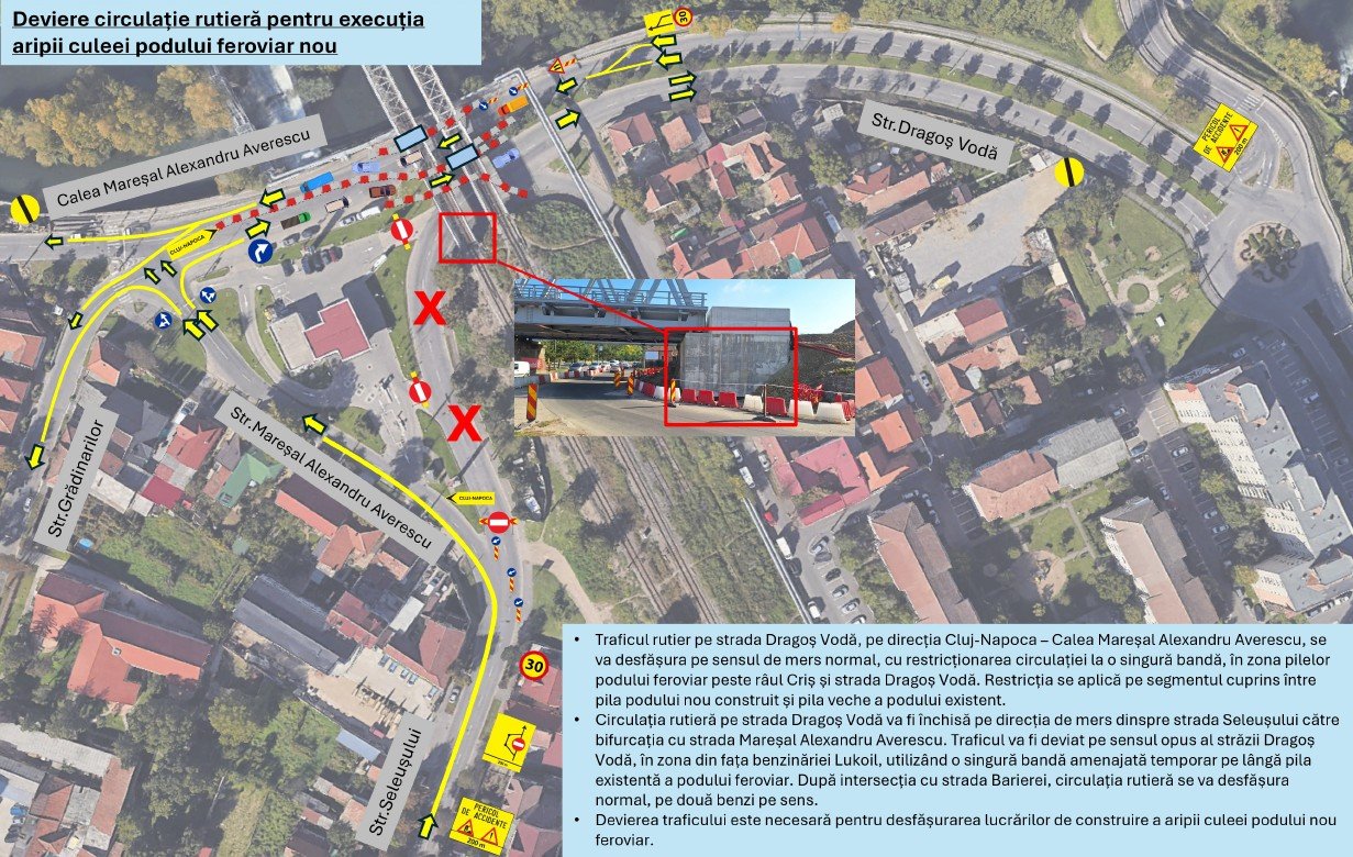 Október 18.–november 18. között forgalomkorlátozás lesz a Dragoș Vodă utcán és az épülő vasúti hídnál. A Dragoș Vodă utcán Kolozsvár irányába egy sávban zajlik a forgalom a vasúti híd közelében lévő szakaszon. A Seleușului utca felől érkező autók nem hajthatnak be a Lukoil benzinkútnál lévő közúti elágazás jobb oldali ágára, hanem az Averescu utcára kell letérjenek, majd a benzinkút mellett elhaladva le lehet térni balra a Grădinarilor utcára, vagy le lehet térni jobbra a Dragoș Vodă utca felé, majd az első körforgalomnál vissza lehet fordulni a városközpont felé. A Dragoș Vodă utca felől a városközpont felé hajtó autósok nem térhetnek le a Grădinarilor utcára, hanem tovább kell menjenek az Alexandru Averescu úton a központ felé.