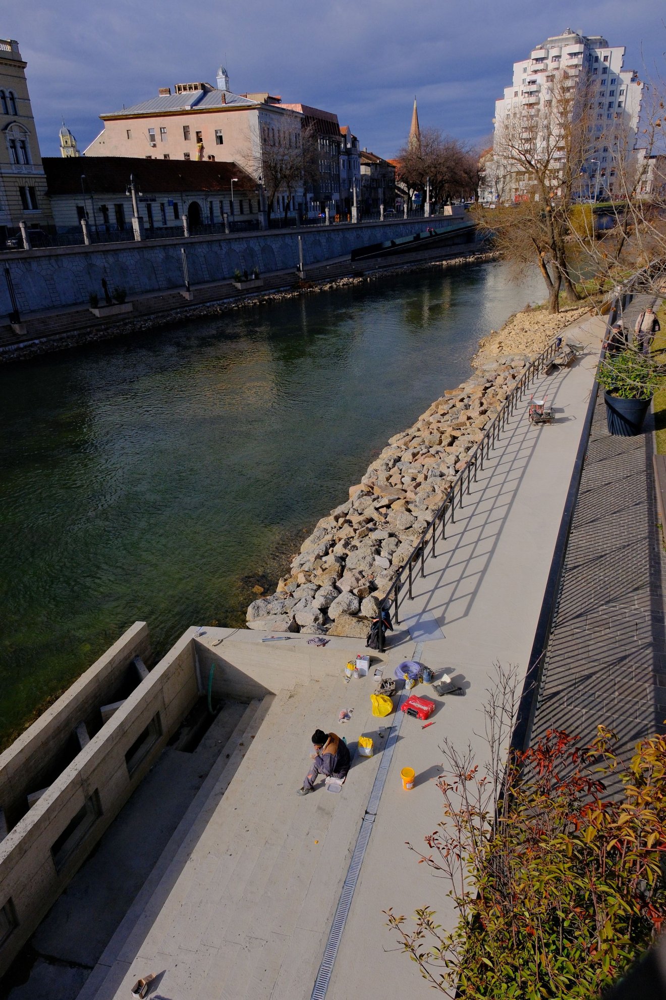 A partrendezési munkálatok keretében kialakítottak egy sétányt, ami a híd alatt is áthalad, összekötve az Emilian Mircea Chitul sétányt és az Ezredévi emlékteret (Libertății utca) a Lévay-ház előtti lépcsőig, továbbá egy hallépcsőt is építenek. E hallépcső újdonsága az, hogy megfigyelőablakokat helyeztek el, amelyek lehetővé teszik a váradiak és a turisták számára a folyószakasz és a halak megtekintését. A sétányt valószínűleg márciusban fogják átadni, fél évvel korábban a szerződésben foglalt határidőhöz képest. A munkálatok 2024 márciusában kezdődtek el. Miután a Körösök Vízügyi Igazgatósága befejezi a munkálatokat, a helyszínen a Nagyváradi Polgármesteri Hivatal végzi el a szükséges tereprendezési és esztétikai munkálatokat.