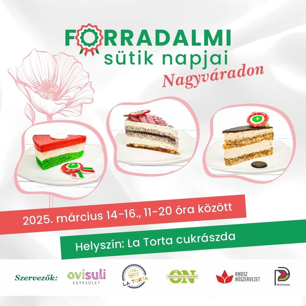 Az Ovisuli Egyesület (Pető Dalma elnök), az RMDSZ Bihar megyei Nőszervezete (Kéry Hajnal elnök), az Összefogás Nagyváradért Egyesület (Somogyi Orsolya elnök) partnerségben a La Torta cukrászdával (Jámbor Levente vállalkozó) az idén újra alkalomhoz illő sütikkel lepi meg az ünneplő nagyváradiakat (és persze nemcsak őket) március 14. és 16. között. Újra a kínálatban lesz a Deák-torta és a piros-fehér-zöld nemzeti színű Szacsvay-szelet marcipán lúdtollal (utalásként arra, hogy Szacsvay Imre mártírjegyzőnek csak „egy tollvonás volt a bűne”) az idei év meglepetés sütije a Mákvirág, amely Magyarország Tortája volt 2024-ben.
