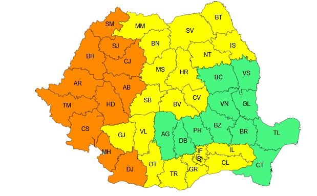 Továbbá hétvégére sárga jelzésű hőségriasztást adtak ki a meteorológusok Máramarosra, Erdély déli és keleti részeire, Moldva északi felére, Olténia keleti és északi részére, valamint Munténia déli felére.Az előrejelzés szerint szombaton és vasárnap déli 12 órától 21 óráig az érintett régiókban a sokéves átlagnál jelentősen melegebb lesz az idő, a csúcshőmérséklet 30 és 35 fok között váltakozik, a hőmérséklet-páratartalom mutató enyhén meghaladja a kritikus 80 egységet.