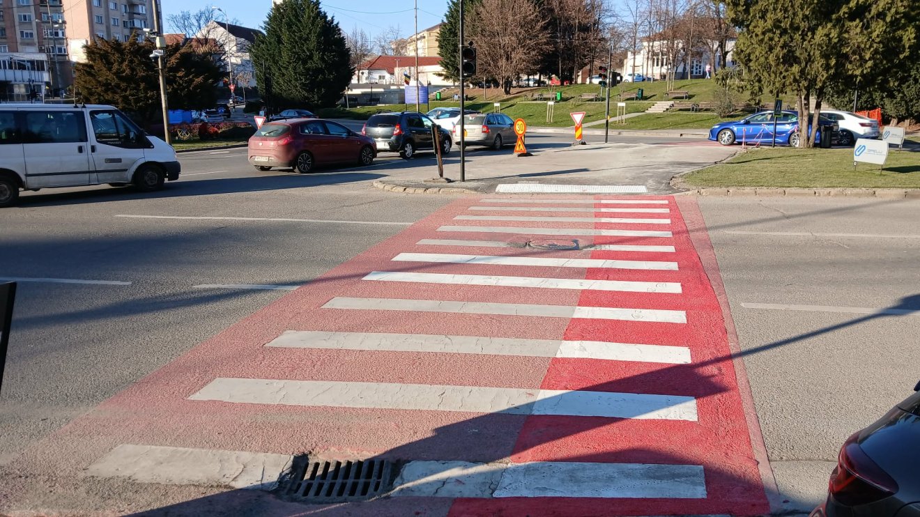A Dacia–Decebal kereszteződésben lévő nagy körforgalom másik, Bors felé vezető oldalán még nem festették újra a felásott sávokat. Reménykedjünk, hogy több belátással lesznek a kivitelezők, és itt a gyalogátkelők teljes felületét újra fogják színezni.