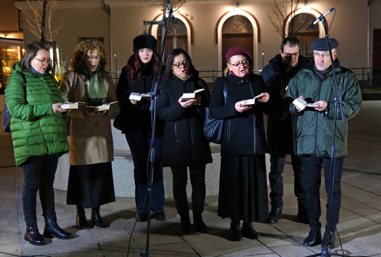 A nemrég megnyílt NOCA kortárs művészeti galéria és a neológ zsinagóga között kihelyezett adventi koszorú körül megjelenteket a szervezők nevében Moldován Gellért Lajos köszöntötte, valamint énekszolgálattal fellépett a székesegyház Szent László Énekkara, Kristófi János karnagy vezetésével.
