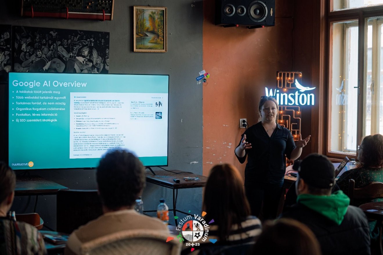 Az előadás első részében Pikó Stefánia a keresőoptimalizálás egyik legfontosabb összetevőjére, a SEO szövegírásra helyezte a hangsúlyt. A szakértő nem ígért könnyű sikert a résztvevőknek – sőt, elsősorban azokra a kihívásokra hívta fel a figyelmet, amelyekkel azok szembesülhetnek, akik ezen a területen szeretnének eredményeket elérni. A végig gyakorlatias hangvételű előadás során a fiatal vállalkozó számos hasznos tanáccsal látta el a hallgatóságot, amit az is jelzett, hogy többen lelkesen jegyzeteltek, jelezve, hogy az elhangzottak vélhetően nem maradnak hatás nélkül. Pikó kitért a mesterséges intelligencia használatára is, amely ebben a műfajban első pillantásra fenyegető lehet a szövegírók számára, de tulajdonképpen hasznos eszközként szolgálhat. Ugyanakkor hangsúlyozta, hogy az AI alkalmazása körültekintést igényel, mivel egyáltalán nem mindegy, hogy hogyan használják azt a szövegírók. Kiemelte, az AI hajlamos a hallucinációra, vagyis valótlan információk generálására, ami később komoly problémákhoz vezethet, ha a tartalmat nem ellenőrizzük alaposan. Összegzésként kijelentette, meglátása szerint az AI még egy jó ideig biztosan nem tudja teljes mértékben pótolni a SEO szövegírókat.