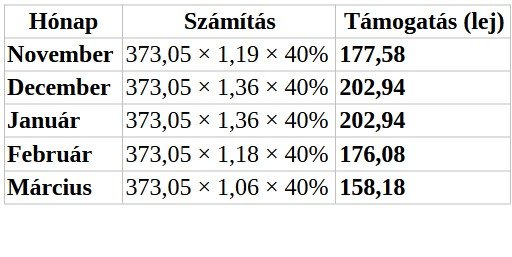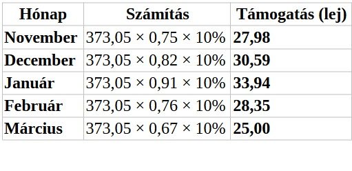 Adott egy kétszobás lakásban élő háromtagú család, amelynek összes nettó havi jövedelme 2775 lej, tehát fejenként 925 lej. A gigakalória ára 373,05 lej, és a kompenzációs arány 40%, mivel a jövedelem 920 és 1040 lej között van személyenként.