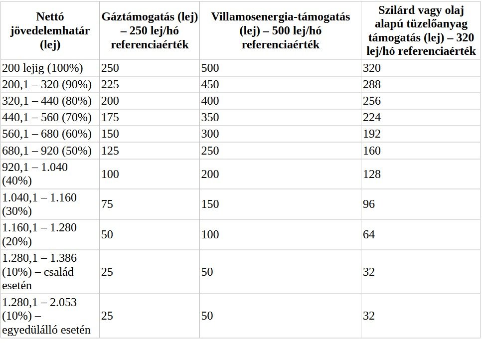 A támogatást igényelhetik azok az egyedülálló személyek, akiknek havi jövedelme nem haladja meg a 2053 lejt, vagy azok a családok, ahol az egy főre eső havi jövedelem nem haladja meg az 1386 lejt. Azon családok esetében, ahol az egy főre eső havi jövedelem kevesebb vagy pont 200 lej, a fűtés teljes költségét megtérítik. Az egy főre eső havi jövedelemtől függően az igénylő családok különböző mértékű támogatásban részesülnek.