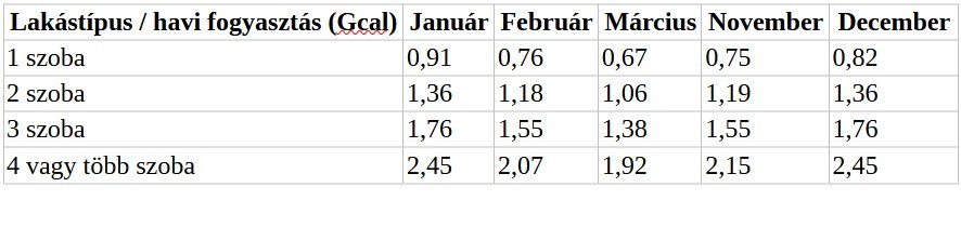 Átlagos havi hőenergia-fogyasztás – mérsékelt éghajlati övezet