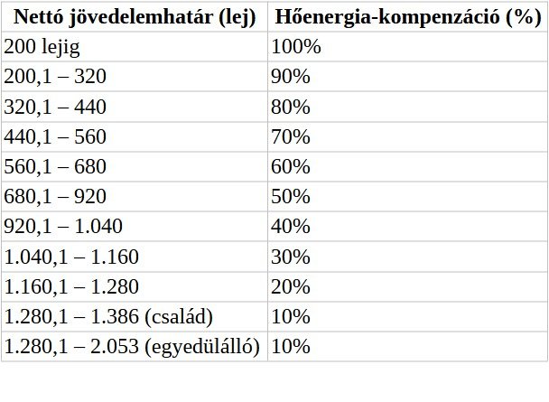 A jövedelemhatárok és a hőenergia-kompenzáció százalékos aránya