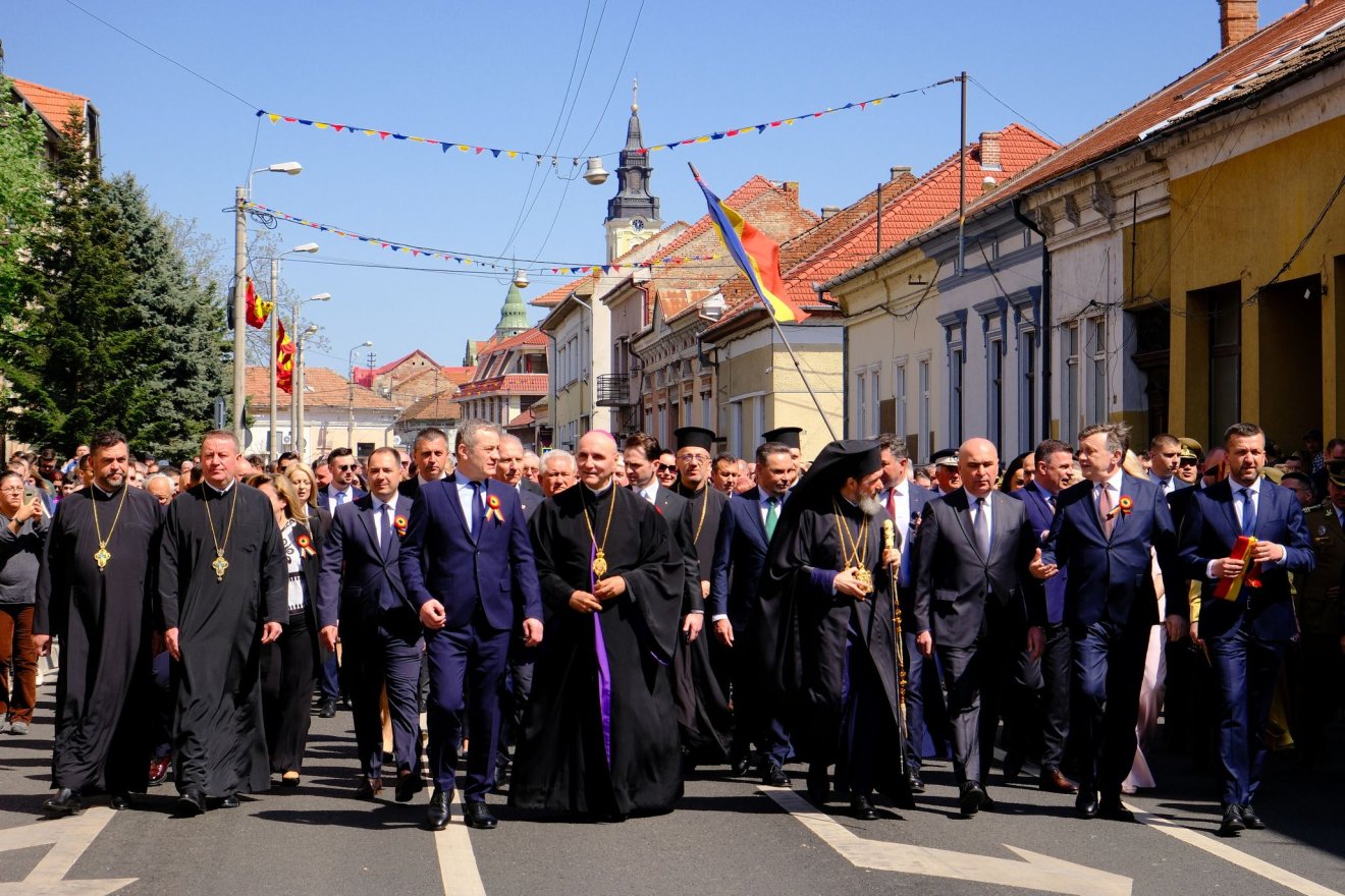 Az ünnepség a Szent László téri Holdas templomban kezdődött. Az ortodox mise, majd a rövid templomi megemlékezés után a magas rangú politikusok, köztük a már említetteken kívül Sebastian Burduja energiaügyi miniszter és Gheorghe Falcă EP-képviselő Sofronie ortodox püspökkel az élen a templomból kijövet rövid időre megállt a bejárat előtt. Itt már népes érdeklődő közönség várta őket, és történt egy incidens is, egy középkorú nő ugyanis rákiáltott a politikusokra: „Elloptátok a pénzünket! Tolvajok! Elvettétek a fizetéseinket! Nem szégyellitek magatokat?!” A több másodpercig tartó szidalmazást Sofronie püspök azzal szerelte le, hogy fennhangon kijelentette: „Krisztus feltámadt!” Erre a tömeg hangosan válaszolt: „Igaz, hogy feltámadt!” – ezzel el is nyomva egyúttal a nő hangját. A magas rangú vendégek átvonultak a görögkatolikus templom, illetve a Radu Demetriu-szobor elé, ahol már várta őket Virgil Bercea görögkatolikus püspök, majd vele együtt vonult végig az ünneplő sereg a Kert (Avram Iancu) utcán Traian Moșoiu szobrához. Itt elsőként Florin Birta, Nagyvárad polgármestere szólt az ünneplőkhöz.