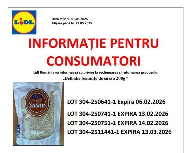 A visszahívás kizárólag a „Belbake szezámmag 200g” fent felsorolt tételszámú termékeit érinti. A Lidl Románia által forgalmazott egyéb termékeket, beleértve a Belbake termékcsalád más termékeit, a visszahívás nem érinti.