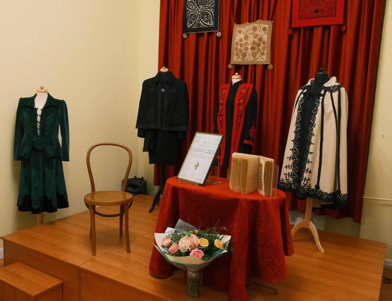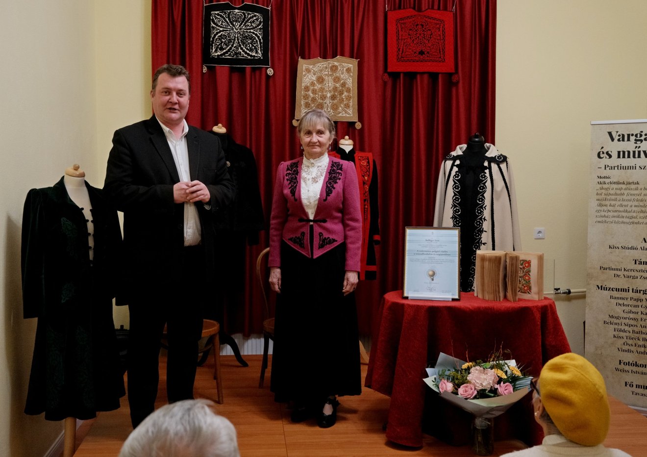 Szilágyi Irén beszélt munkásságának kezdetéről, indulásáról: egy házaspártól ajándékba kapta Györffy István A cifraszűr egyik dedikált, eredeti példányát. Ezt követően beszélt alkotásairól, így a nagyváradi nyakas szűr születésének történetéről. Megemlítette: amikor Szombathelyre került, kiderült, hogy a Dunántúlon senki sem foglalkozott a szűrrátéttel, majd bemutatta a szombathelyi szűrt 1873-ból, amit Győrffy István könyve alapján elkészített. Szintén így született a dunántúli kocsisszűr, ami fekete díszítést jelent fekete alapra. Érdekességként elmondta, hogy amikor Ausztriában élt és alkotott, a helyi rendezvényekre szóló meghívókban benne volt, hogy viseletben kell megjelenni. Magyarként felvetődött a kérdés, hogy vegyék fel az osztrákok viseletét, vagy menjenek a sajátjukban ezekre a rendezvényekre, s ekkor kezdett újra a szűrrátétesekkel foglalkozni. Az osztrákok hozzáállását maga is követendőnek ajánlotta, hiszen, mint mondja: Ausztriában egy falunapon a tősgyökeres és a beköltöző osztrák is viseletben jelenik meg. „Akkor kezdtem el ezeket a ruhadarabokat újragondolni, ha nekünk is van viseletünk, amiről látszik, hogy a sajátunk, akkor abban jelenjünk meg” – zárta szavait az alkotó.