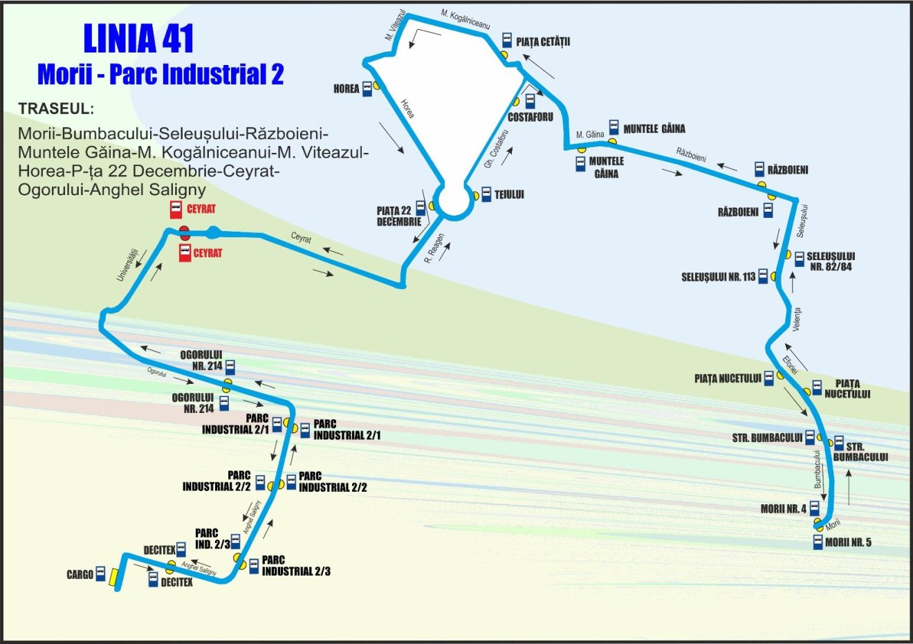 - a Morii utca 5. szám felé: Cargo – Decitex - ipari park 2/3 - ipari park 2/2 bis – ipari park l 2/1 bis – Ogorului 214. szám – Ceyrat – Teiului - Gheorghe Costaforu – Muntele Găina – Războieni – Seleuşului 113. szám – P-ţa Nucetului – Bumbacului utca– Morii 4-szám – Morii 5. szám. Az új járat menetrendjét kifüggesztik az érintett megállókban, de az OTL honlapján is tanulmányozható.