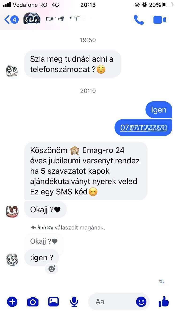 Az átverési kísérletre egy népszerű Facebook-csoportban figyelmeztetett egy nagyváradi nő. A csaló valamelyik Facebook-ismerősünk nevében küld üzenetet a Messenger alkalmazáson keresztül, amelyben arra kér, adjuk meg a telefonszámunkat. Amint ezt megadtuk, egy nyereményjátékon való részvételre hivatkozva SMS-ben érkező kódot kér, ami valójában a Facebook-fiók jelszómódosítását tenné lehetővé.