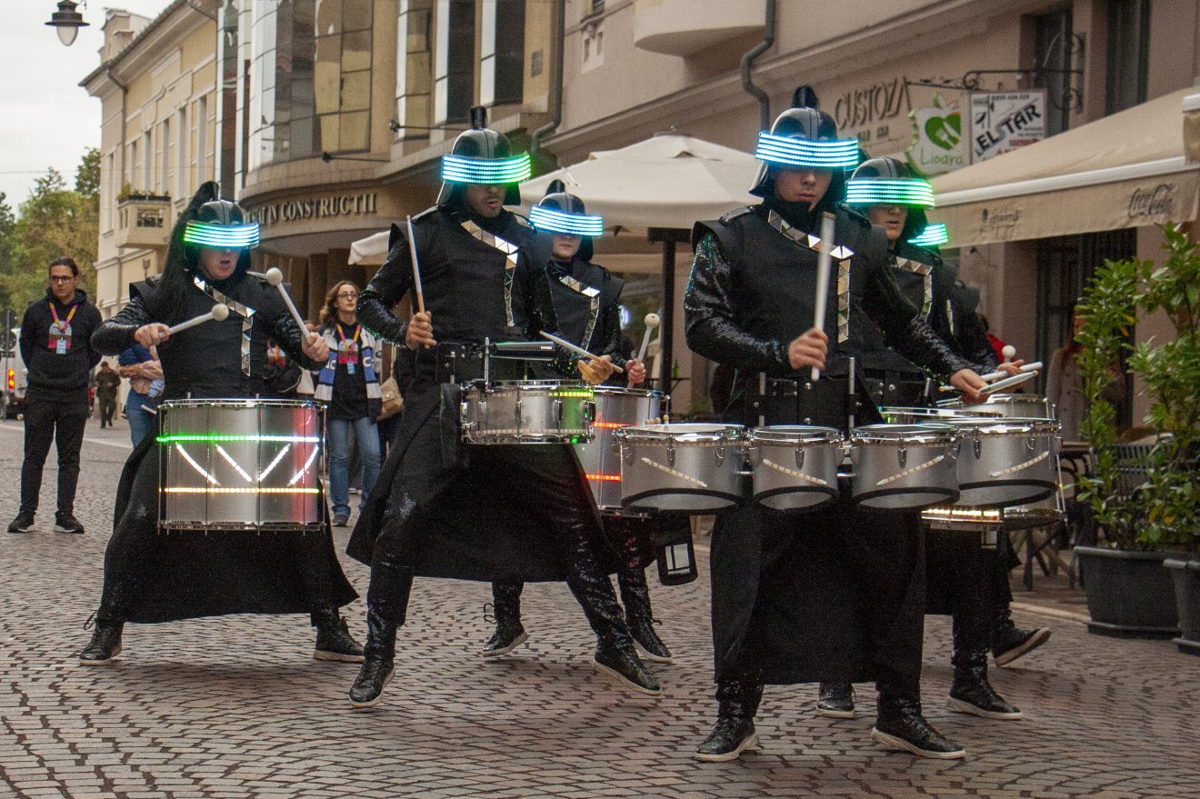 Igazi fesztiválhangulatot teremtettek Várad központjában a hétvégén zajló Festifallon felvonuló utcai mutatványosok. Annak ellenére, hogy az időjárás eléggé mogorva volt, már péntek délután sokan végigkísérték a Zöldfa (Vasile Alecsandri) utcáról, illetve a Bémer (Ferdinand) térről induló színes megjelenésű társulatokat. Előbbi helyszínről a Dark Squad nevet viselő csoport indult, amelynek tagjai dobpergéssel rázták fel a szürke időjárás melankóliájában sétálókat.