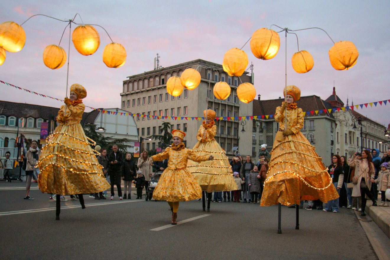 A Carrousel társulat tagjai gólyalábakon, lampionnal indultak a Bémer térről, hogy a 18 órától lezárt Szent László hídon keresztül a főtérre „libbenjenek” át.