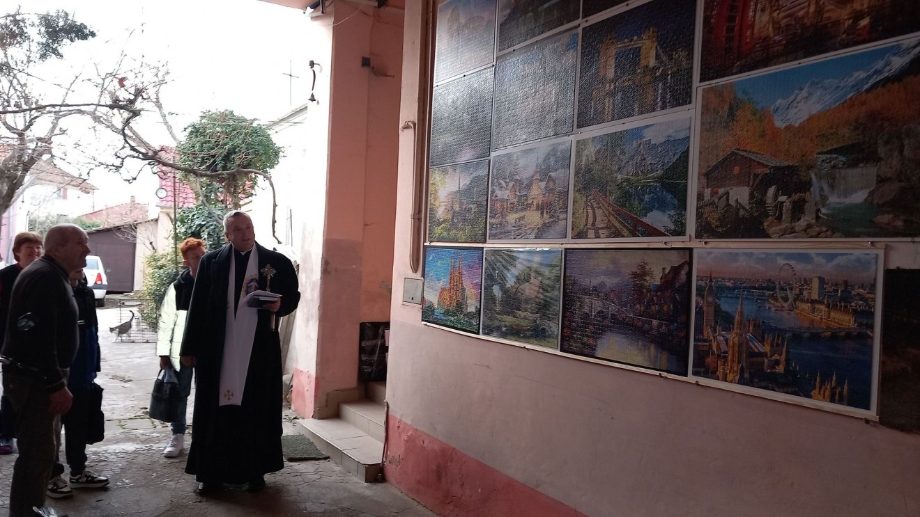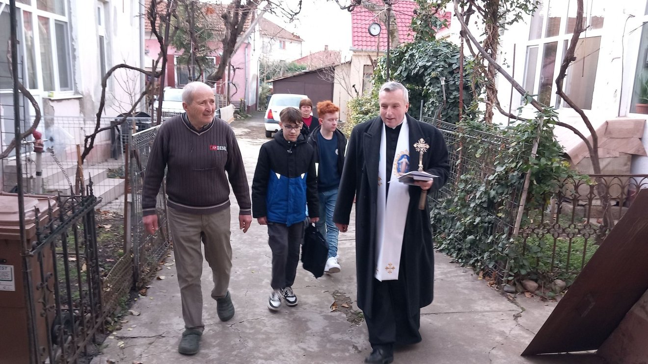 A Lukács György (Nicolae Jiga) utca Körös áruház felőli részén várakozom Szabó Ervinre, a Barátok temploma plébánosára kedd délelőtt, az egyik kapualjban kisvártatva fel is tűnik két ministránsnak a kíséretében. A másik csapattal (már ha annak nevezhető két személy), Nagy Jácint káplánnal és Kiss Géza kántorral néhány perccel korábban futottam össze a megyei tanács leendő székhelye mellett. Ők az ellenkező irányba, a Sztaroveszky (Magheru út) felé indultak hasonló céllal. Én Ervin atya mellé szegődöm, az egykori Gesztenyefasoron csengetünk be néhány lakásba, ahol már várnak bennünket. A sors – vagy a gondviselés – pedig úgy hozza, hogy egyetlen kivételtől eltekintve több generáció is él egy fedél alatt, illetve egymás közelében, vagy közös udvarral rendelkezik a rokonság. Az említett kivétel máris az első helyszín, ahol a köröstarjáni felmenőkkel rendelkező Nagy Erzsébet fogad kedvesen bennünket. Az egyik szobába belépve Szabó Ervin, akárcsak a többi lakásban, a szentelőimában azt imádkozza: a házban, illetve bárhol, ahol valamit megérint a szentvíz cseppje, az legyen tisztává, minden ártó hatalomtól mentessé, és szűnjön meg a belopakodó Sátán minden cselszövése. Ezután a Miatyánkot mondva szenteltvízzel hinti meg a helyiségeket, távozás előtt pedig az egyházmegye éves kiadványát és egy öntapadós matricát ad ajándékba. Utóbbin három betű olvasható, az aktuális évszámmal (2025): C, M, B, vagyis annak a latin nyelvű mondatnak a rövidítése, hogy „Krisztus áldja meg ezt a hajlékot”.