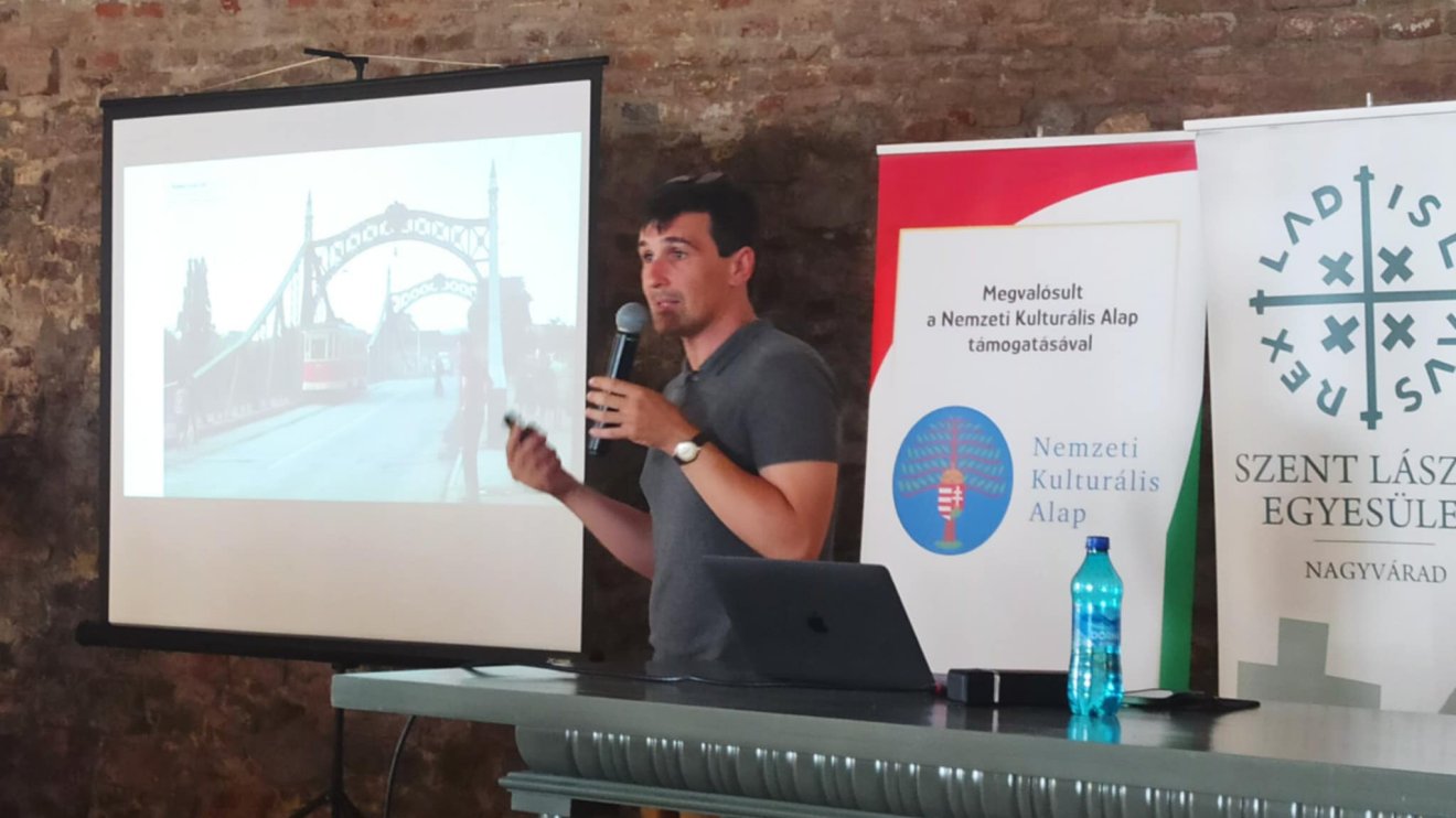 Zuh Deodáth részletesen bemutatta a híd és a címer történetét, és rámutatott: ezek az építmények nem pusztán mérnöki produktumok. „Amikor egy épületet vizsgálunk, tudnunk kell, hogy megjelenését számos tényező alakítja: politika, eszmetörténet, filozófia, szociológia, mérnöki tudományos meglátás” – fogalmazott. A Széles utcai híd esetében – amelynek legfontosabb kontextuális párhuzama a budapesti Szabadság híd – érdemes megfigyelni, hogy