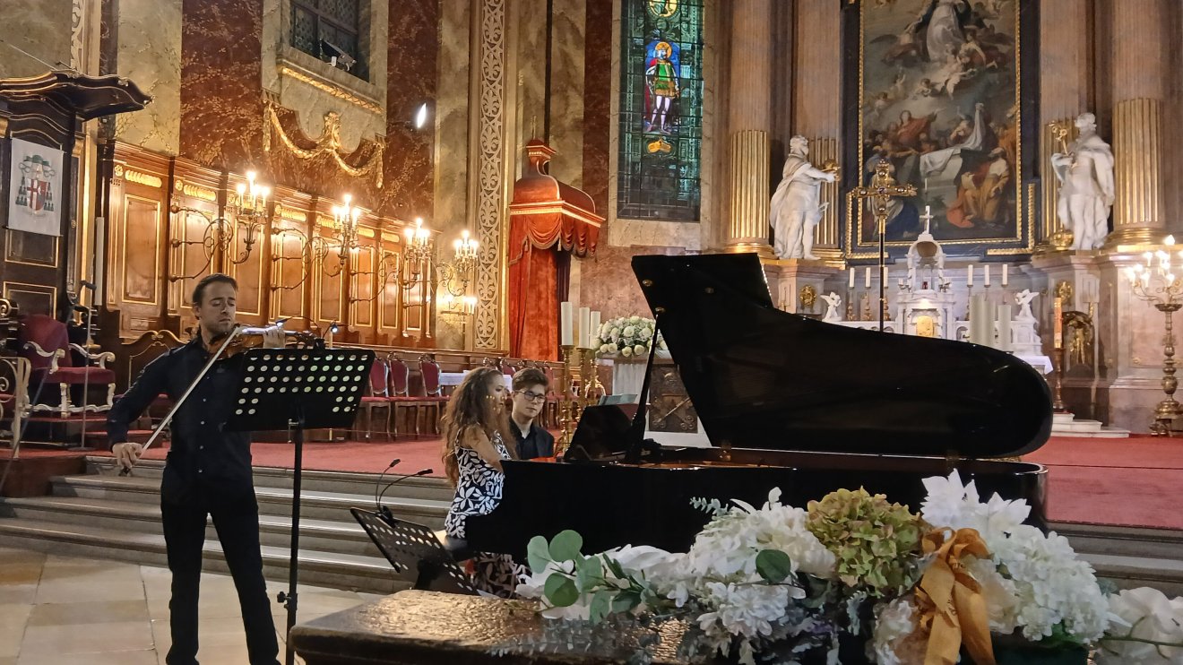 Először a „gyerekek”, azaz Lily és Sascha Maisky léptek a közönség elé az oltár előtt berendezett koncerthelyen, és adták elő Clara Schumann szerzeményét, a Három románcot hegedűre és zongorára. A szépen kidolgozott romantikus kompozíció jelzi, hogy Clara Schumann nem egyszerűen csak Robert Schumann felesége volt, hanem autonóm, férjével egyenrangú alkotó is.