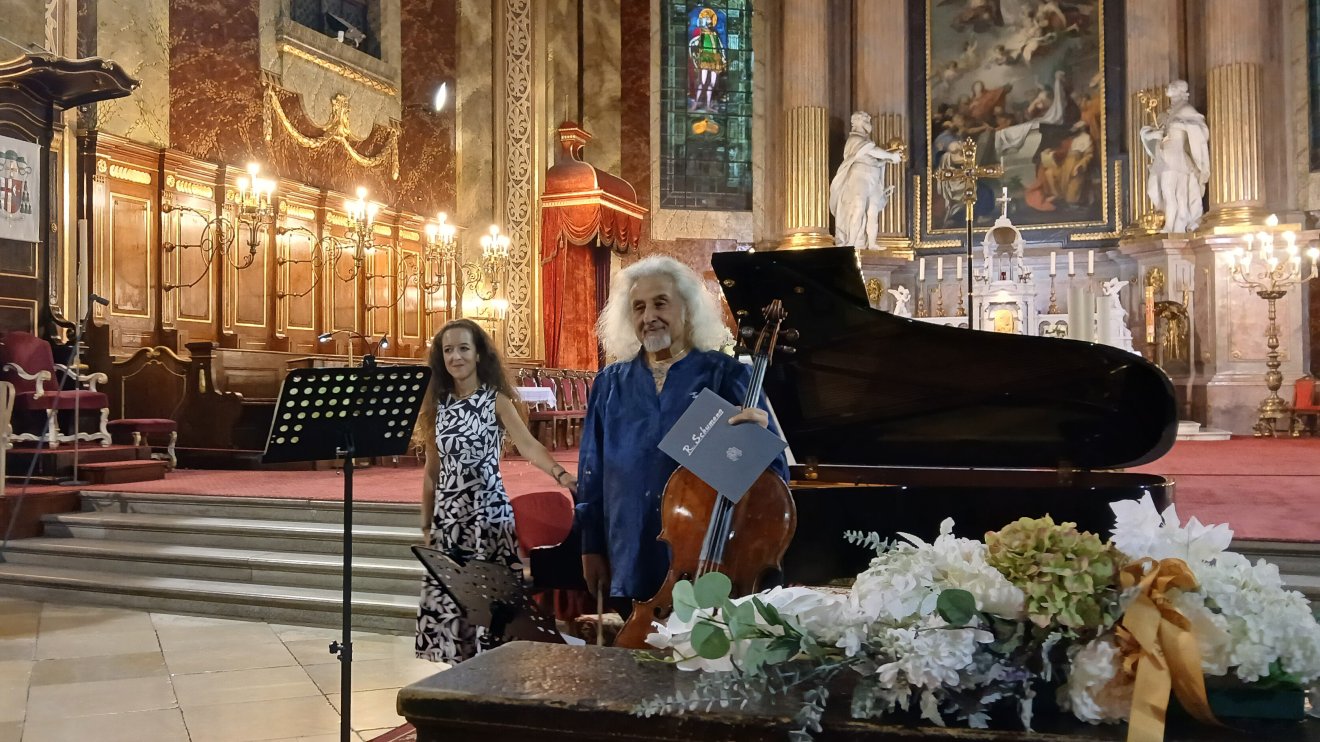 A koncertnyitó darab után az idén hetvenhét éves Mischa Maisky vonult be csellójával, a lánya kíséretében, hogy Robert Schumann-szerzeményeket adjanak elő: elsőként az op. 74. no. 1. műjegyzékszámmal ellátott Románc csellóra és zongorára című darabot, azt követően A költő szerelme (Dicterliebe) című dalciklusból zongora-cselló átiratban négy darabot (az I. az V., a X. és a XII. számúakat), illetve a Myrthen-dalciklusból az elsőt. Szünet előtti utolsóként is egy Robert Schumann-szerzemény csendült fel, az op. 73. jegyzékszámú, a zeneszerző által eredetileg klarinétra és zongorára írt Fantáziadarabok, de már maga a komponista jelezte, hogy a fúvós hangszer hegedűvel vagy csellóval helyettesíthető. A két testvér is összeszokottan játszott, mint ahogy az is látszott és hallatszott, hogy Mischa Maisky is hosszú évek óta együtt muzsikál 1987-ben született lányával.