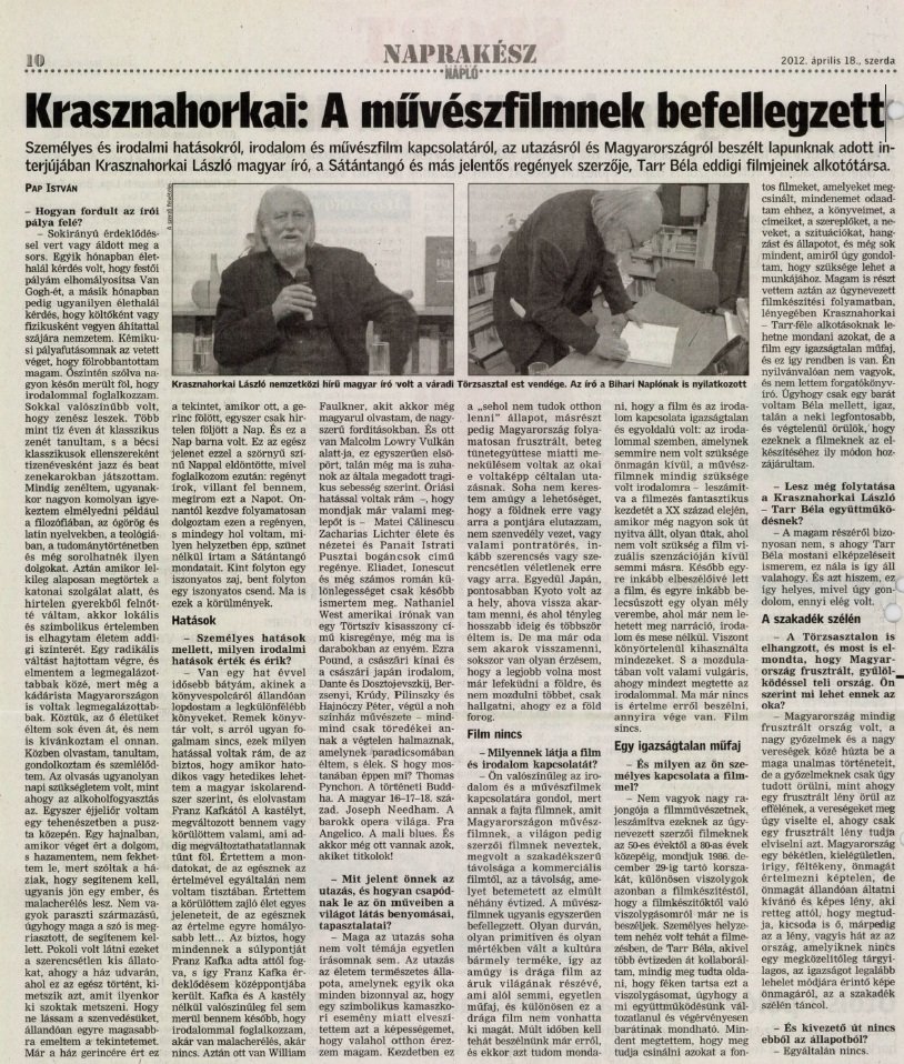 Forrás: Bihari Napló, 2012. április 18., szerda. Krasznahorkai László a Törzsasztal-est vendégeként járt Nagyváradon, mely alkalommal a Bihari Naplónak is nyilatkozott.