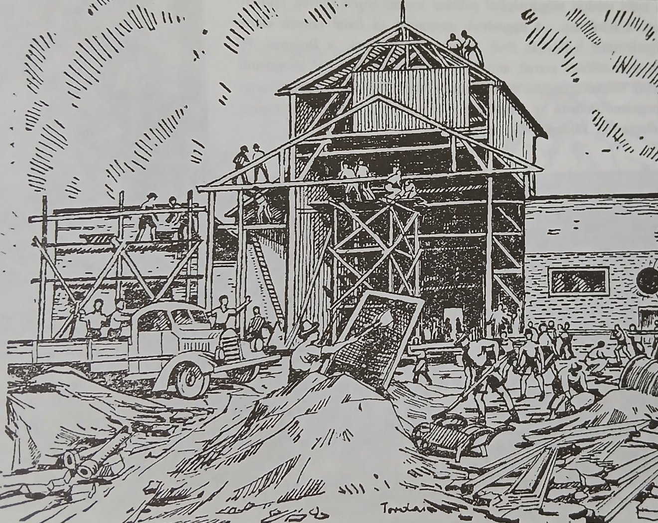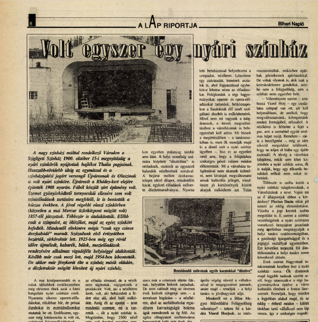 „Téglákkal és más építkezési anyagokkal megrakott nagy tehergépkocsik kanyarodnak be a szélesre tárt kapun, a nyüzsgő munkatelepre. Szürke porfelhő száll nyomukban, amint a téglatörmelék között áthajtanak az építkezés színhelyére. Fürge ifjak ugrálnak le és pár pillanat múlva már lepakolják a gépkocsik terhét. A téglát szépen oszlopba rakják, a gerendákat odébb, mert azokra később kerül sor. A színpad alapzatának már részben kiásták a helyét, mintegy másfél méter mély árkot. (…) Az üzemek dolgozói segítségére siettek a színháznak: 51 üzem, köztük intézmények és állami kereskedelmi vállalatok ajánlották fel támogatásukat rövid pár nap alatt. (…) a legértékesebb és legszebb felajánlást azok tették, akik önkéntes munkával biztosítják a színház fölépítését. Több mint 15 ezer önkéntes munkaórát vállaltak eddig az üzemek és intézmények dolgozói. A hídépítésen (a jelenlegi Szent László hídról van szó – szerk. megj.) kívül nem volt még városunkban ilyen építkezés, ahol annyi szorgos kéz foglalatoskodott volna, ahol minden téglát más és más helyez rendeltetési helyére. Nem volt még ilyen épület Váradon, amelynek alapját ezernyi ember ásta önként vállalt munkával. (…) A színház művészei és technikai dolgozói vállalták a legtöbb önkéntes munkaórát. Személyenként 30–50 órát ajánlottak fel. Ezenkívül több előadást tartanak, amelynek tiszta jövedelmét mind a nyári színház építkezésének költségeire fordítják. A múlt napokban jól sikerült bált rendeztek, melynek jövedelmét ugyancsak a nyári színház építkezési alapjába pótolták. Az önkéntes munkába szervezetten kapcsolódtak be. Négy brigádot alakítottak: ifjúsági-, műszaki-, béke- és egy színészbrigádot. Eddig az ifjúsági brigád dolgozott legtöbbet, Cseke Sándor, Mogyoróssy István, Bencze Ferenc és Borsos Barna személyében. Az ifjúsági brigád női tagjai közül Szokolay Zsuzsa tűnt ki. Vajda András és Halasi Gyula kubikos munkát végzett. Kovács Apollónia a téglapucolásnál szorgoskodott, Dukász Anna az előkészítő bizottságban és a végrehajtó bizottságban tevékenykedik, mint képviselő. Simon György és Gulácsy Albert a szén- és téglahordásnál dolgozott.”