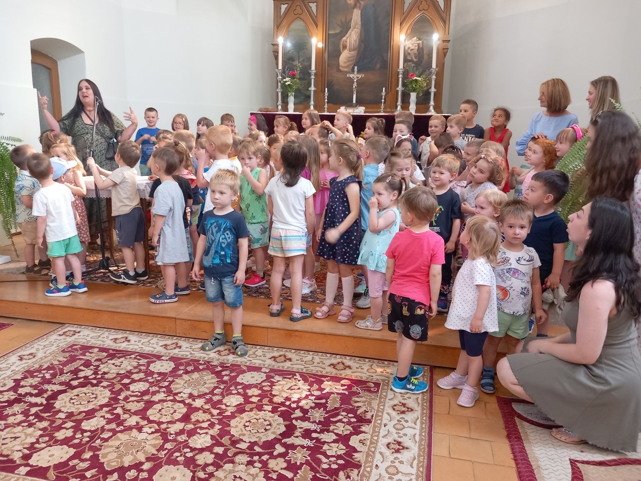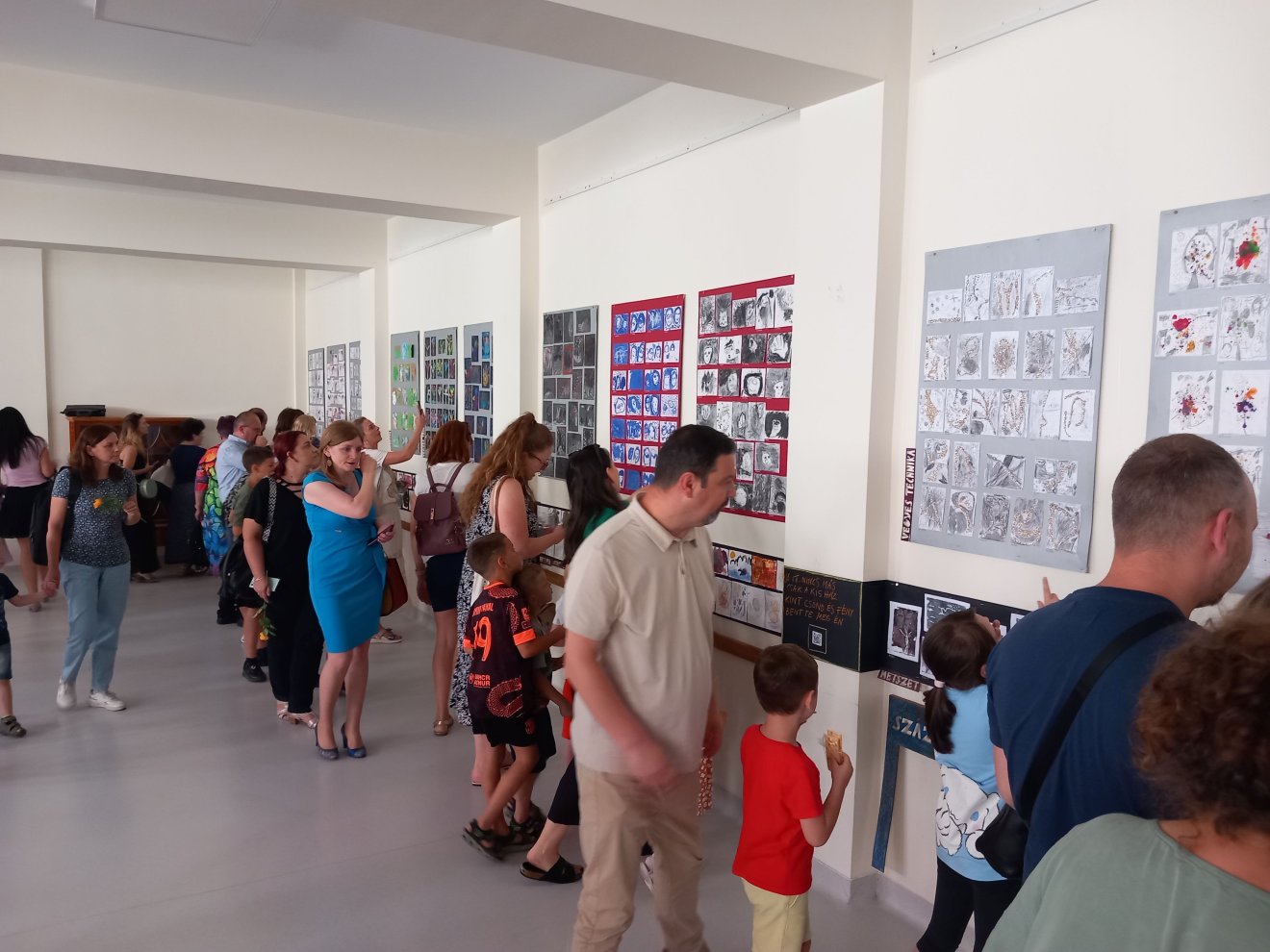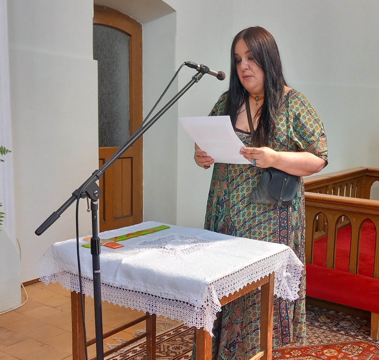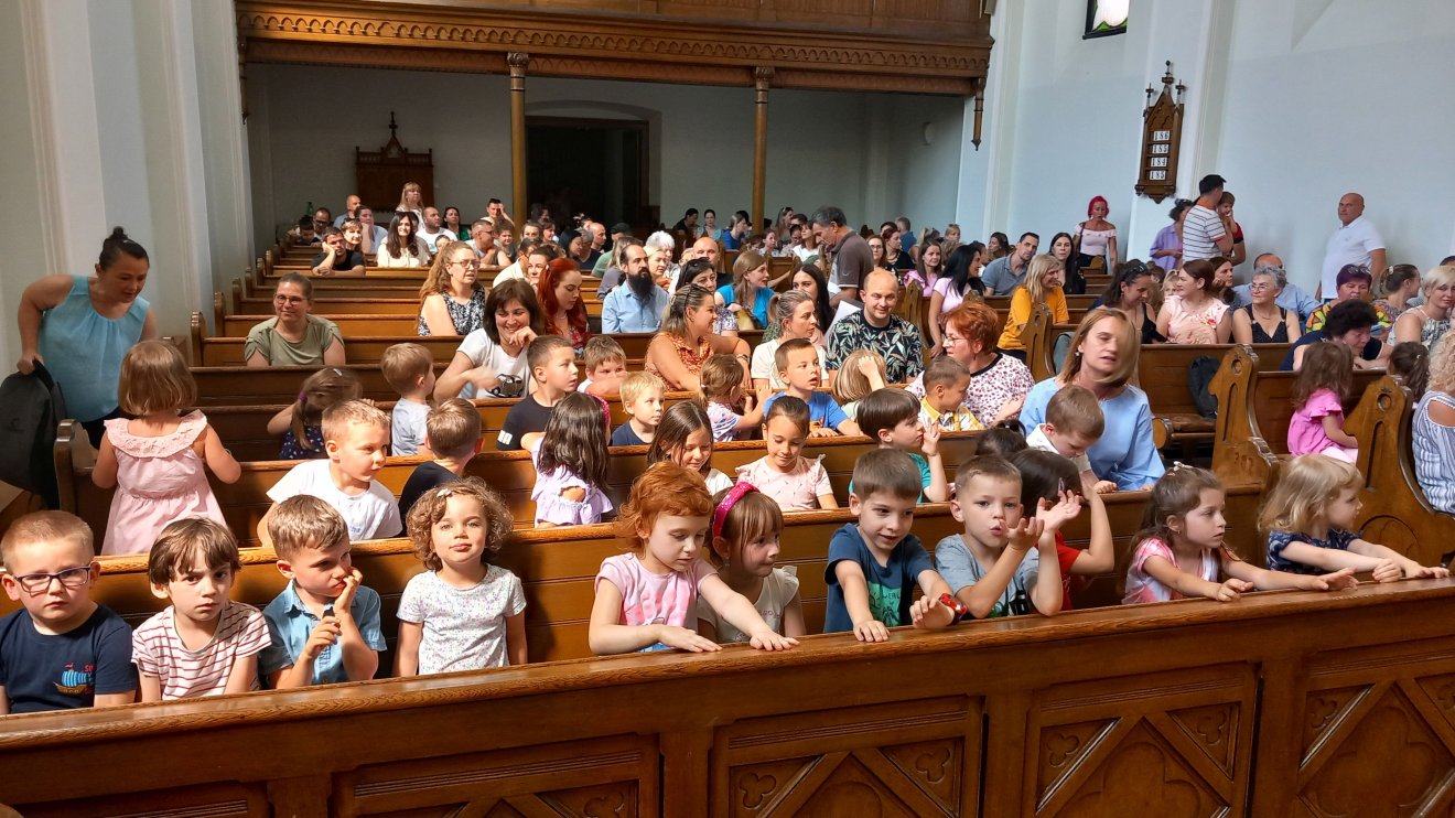 A vernisszázst a kánikula miatt a gyülekezeti háznál sokkal hűvösebb evangélikus templomban tartották, ahol Mátyás Attila lelkipásztor köszöntötte az ünneplőket, kiemelten Nagy Gabriellát, a művészeti líceum igazgatóhelyettesét, Tankó Zita tanfelügyelőt és Rusz Csilla tanítónőt.