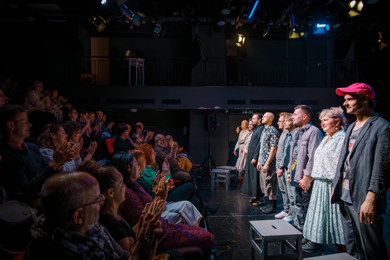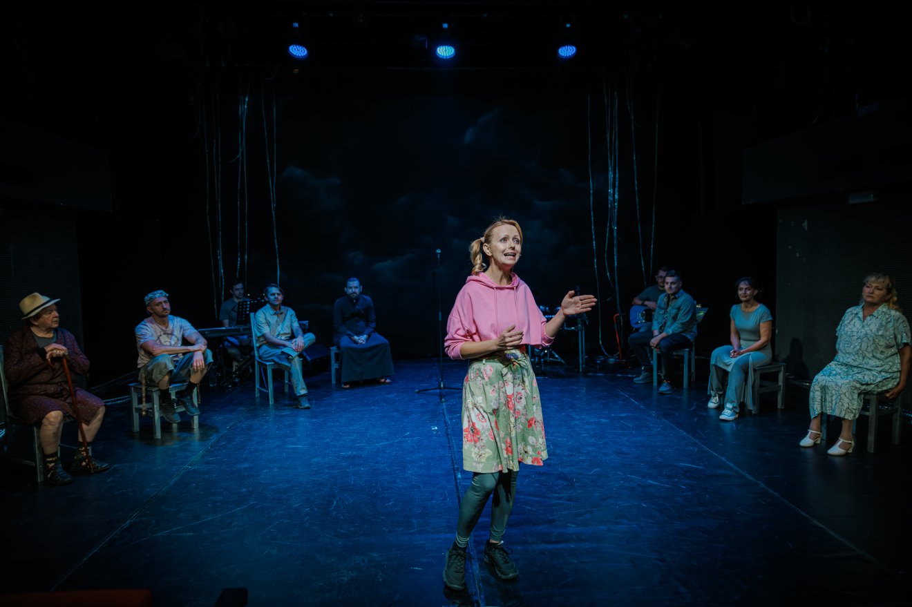 A dokumentarista őszinteség, a színházi fikció és a nézőkkel való interakciók sajátos egyensúlya teremt különös feszültséget a Transilvania Stúdió színpadán, ahol a színészi játékot minimális kelléktár (tucatnyi szürkére festett szék) egészíti ki.