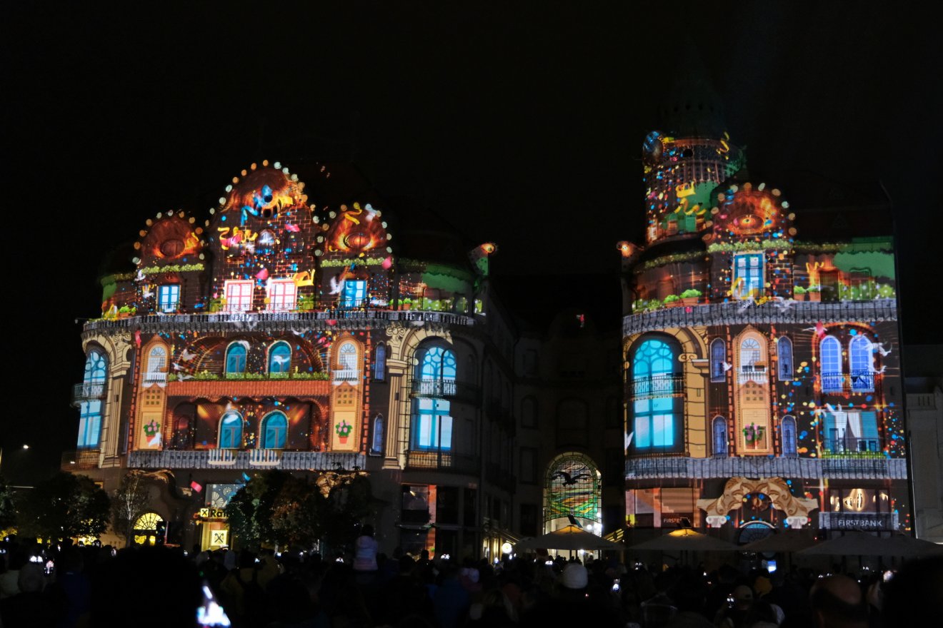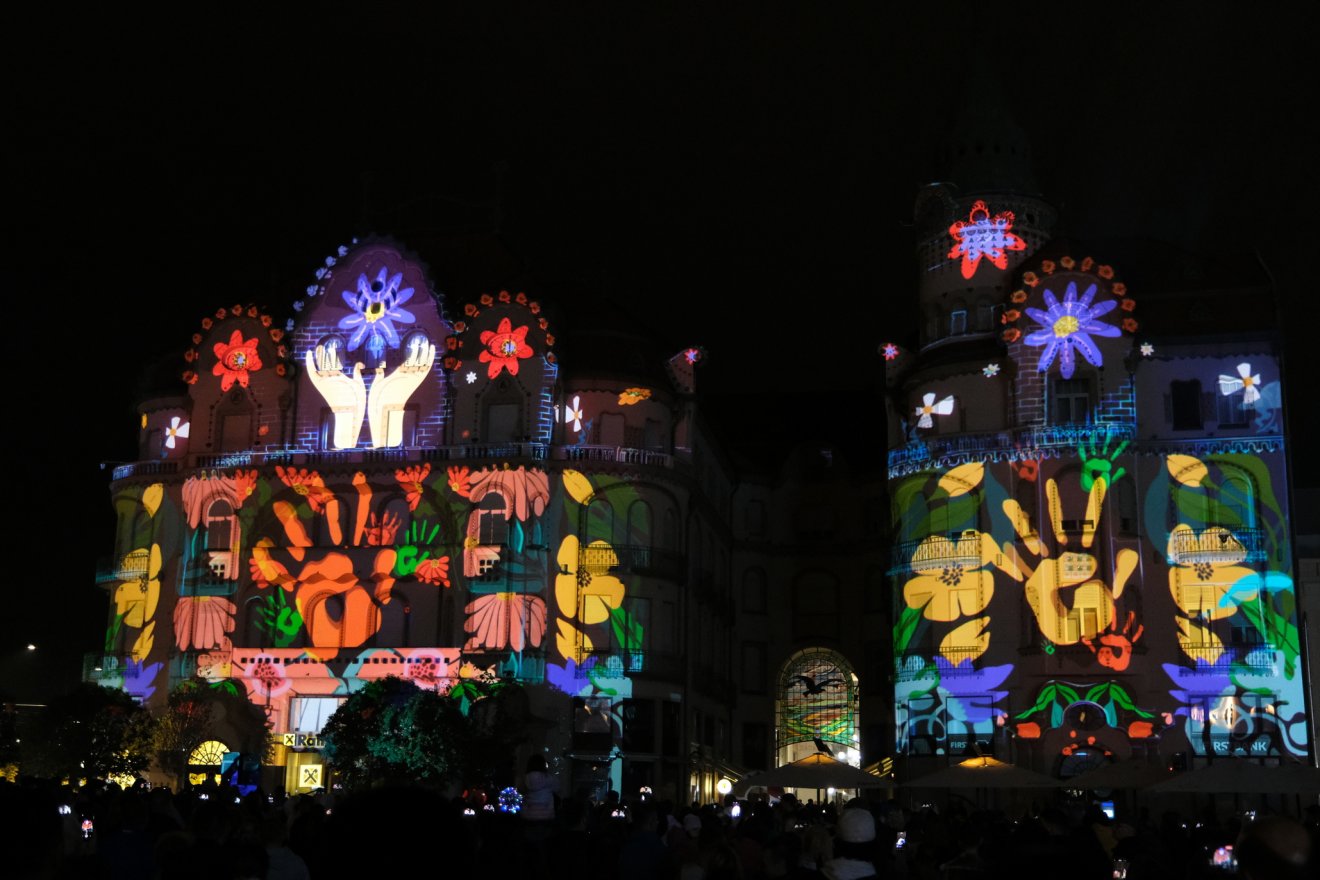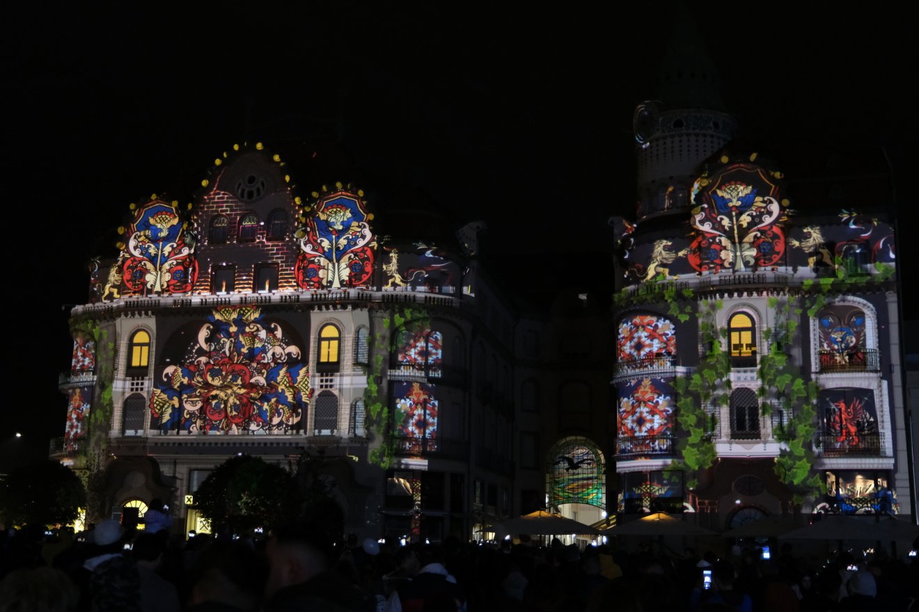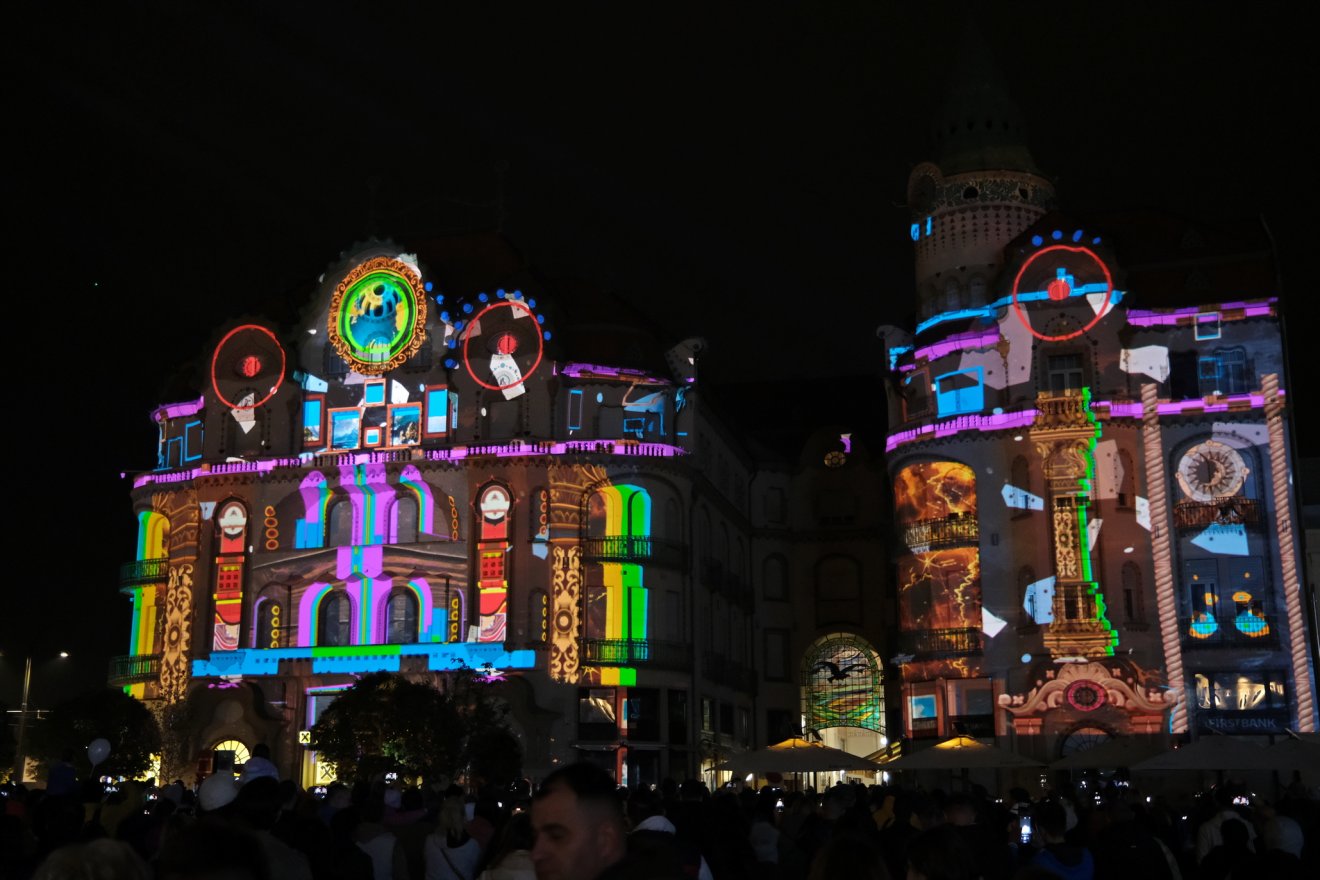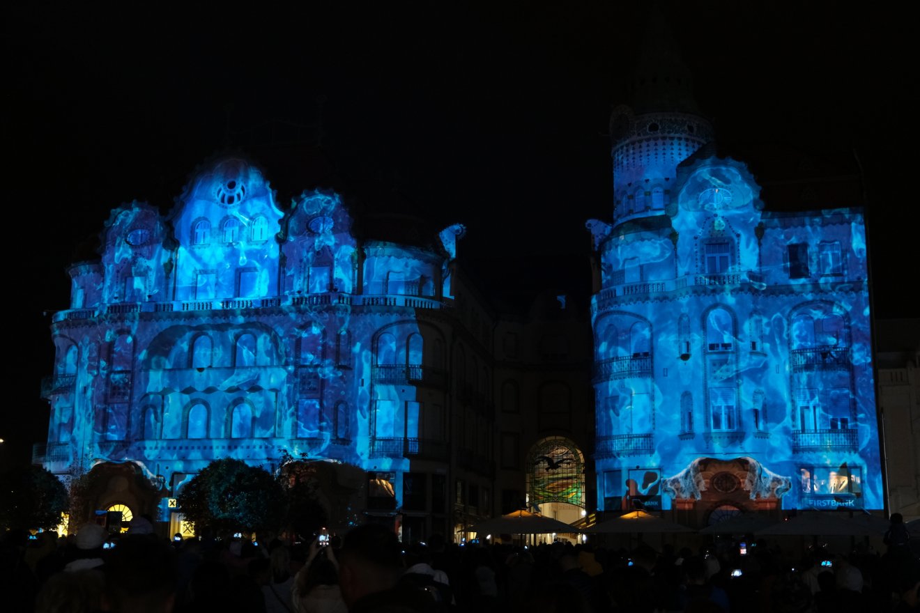 A péntek esti kórushangverseny után este kilenc órától kezdődően óránként látványos, színes épületvetítést mutattak be a Fekete Sas homlokzatán.