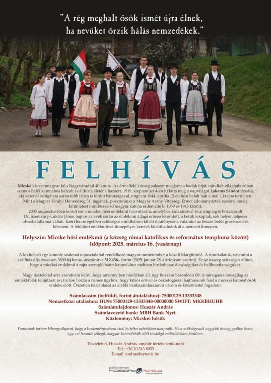 „2005 augusztusában tartották a micskei hősi emlékmű felavatását, amelyhez kutatásaival és anyagilag is hozzájárult dr. Szentváry-Lukács János. Sajnos az évek során az emlékmű állaga erősen leromlott, a betűk lekoptak, sok helyen teljesen olvashatatlanná váltak. Ezért lenne égetően szükséges mindhárom táblát újrafényezni, valamint az összes betűt gravírozni és kifesteni. A római katolikus és református templom közt található felújított emlékművet ünnepélyes keretek között adnánk át a nemzeti ünnep alkalmából, március 16-án, vasárnap. A kivitelező egy komoly szakmai tapasztalattal rendelkező magyar mesterember a közeli Margittáról. A munkálatok, valamint a szállítás díja összesen 3800 lej lenne, átszámítva 312.436 forint (2025. január 28-i árfolyam szerint). Ez az összeg szükséges ahhoz, hogy a micskei emlékmű a rajta szereplő bátor katonák nevéhez méltóan hirdesse dicsőségüket és halhatatlanságukat” – olvasható a Huszár András amatőr történelemkutató által közzétett adakozási felhívásban.